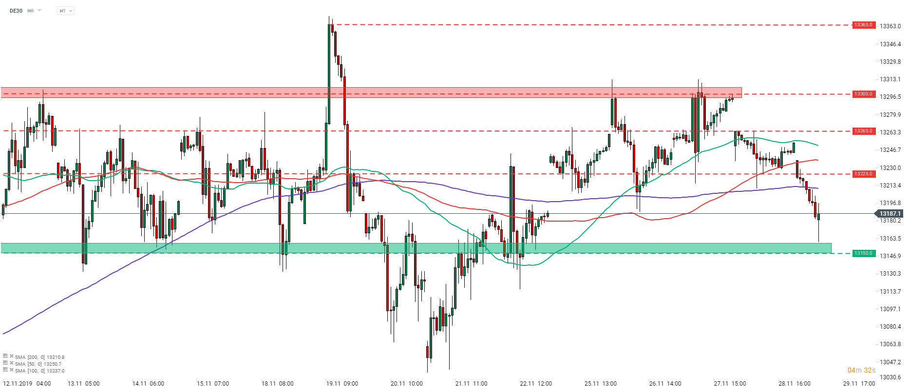 Le DE30 a testé une zone de support au-dessus de la zone des 13150 pts au début de la séance ce vendredi. La zone marque la limite inférieure de la fourchette de négociation et s'est arrêtée à la baisse plusieurs fois en novembre déjà. Le creux initial a été presque complètement effacé. Cependant, il faut garder à l'esprit que la même histoire a été jouée hier après l'ouverture de la séance - le DE30 a baissé, a récupéré les pertes et a par la suite relancé la tendance à la baisse. Cela dit, la zone de support susmentionnée pourrait demeurer en jeu pendant le reste de la journée. En ce qui concerne les niveaux de résistance potentiels à surveiller, il faut se concentrer sur la moyenne mobile à 200 heures (ligne violette, 13210 pts) ainsi que sur le niveau marquant un point médian de la fourchette de négociation (13225 pts).