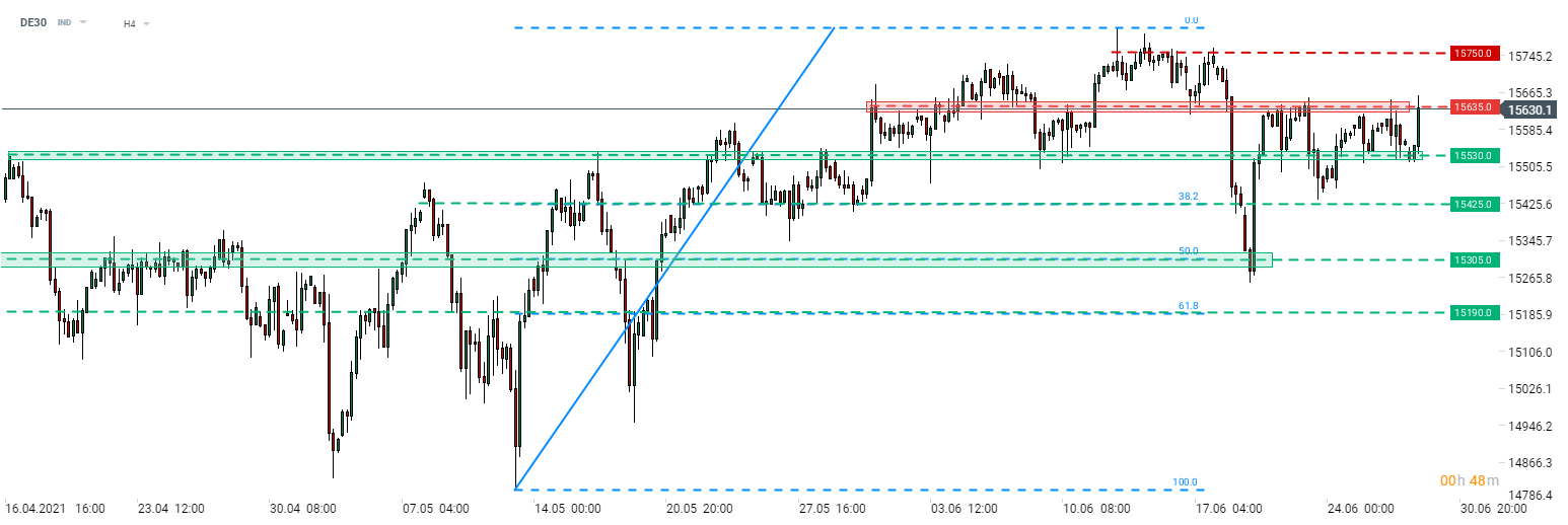 Le range à court terme du DE30 a été préservé jusqu'à présent. L'indice allemand a chuté et a testé la limite inférieure à 15 530, mais les haussiers ont réussi à défendre la zone. Un fort mouvement de reprise peut être observé aujourd'hui et l'indice a testé la limite supérieure de la fourchette à 15 635 pts au début du trading au comptant d'aujourd'hui. Jusqu'à présent, les haussiers n'ont pas été en mesure de franchir cette limite, mais l'indice continue de se négocier dans la zone de résistance. En cas de cassure à la hausse, le prochain objectif pour les haussiers sera la zone des 15 750 pts, marquée par des sommets historiques.