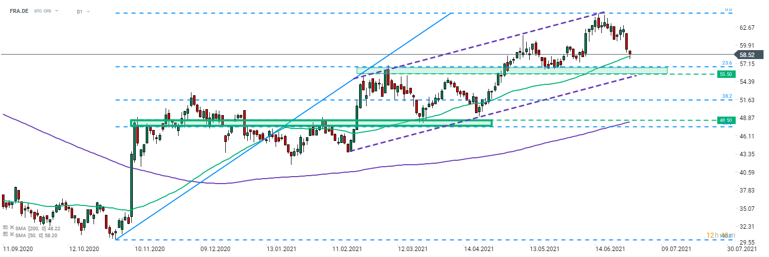 Fraport (FRA.DE) subit un coup aujourd'hui dans un contexte de craintes croissantes qu'une nouvelle variante de la pandémie de coronavirus ne conduise à la réimposition de restrictions. Les actions testent la moyenne mobile à 50 séances (ligne verte). Une cassure en dessous de cet obstacle ouvrirait la voie à un test d'une zone de support majeure comprise entre 55,50 € et le retracement de 23,6 %. La limite inférieure du canal ascendant se trouve également dans cette zone. Source : xStation5
