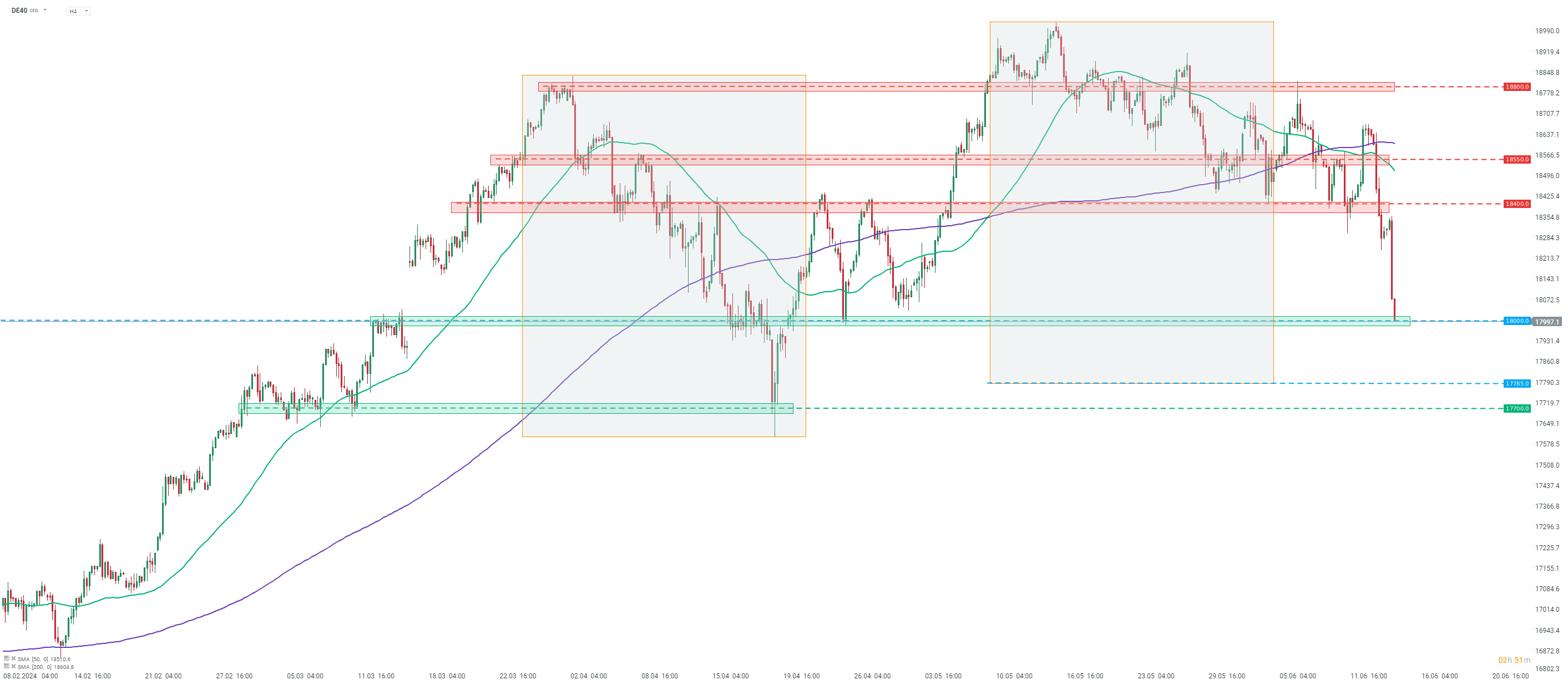 Les indices boursiers du Vieux Continent rencontrent des difficultés cette semaine. Une forte incertitude politique, provoquée par l'annonce d'élections législatives anticipées en France, ainsi qu'une réunion de la Fed au ton plus conservateur, exercent une pression sur le sentiment à l'égard des indices européens cette semaine. Le DAX 40 allemand perd près de 4 % depuis le début de la semaine, tandis que le CAC40 français est le plus grand perdant de la semaine en Europe, avec une chute de plus de 5 % depuis le début de la semaine, effaçant ainsi les gains réalisés cette année.