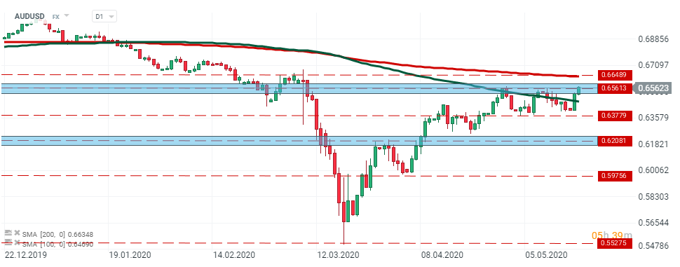 L'Aussie est l'une des principales devises qui a connu des mouvements au cours de la séance de négociation d'aujourd'hui. Parallèlement, le dollar index a continué de s'affaiblir mardi, prolongeant la baisse de 0,8% enregistrée lundi (la plus forte baisse en un jour depuis le 27 mars). La paire de devises teste à nouveau le principal niveau de résistance à 0,6560. Aujourd'hui, cette zone a déjà été testée au début de la séance européenne où le cours a reculé. Cependant, les baissiers n'ont pas réussi à faire tomber les cours sous le plus haut du 13 mai , qui a fait réagir la paire de devises, pour rebondir sur ce seuil.