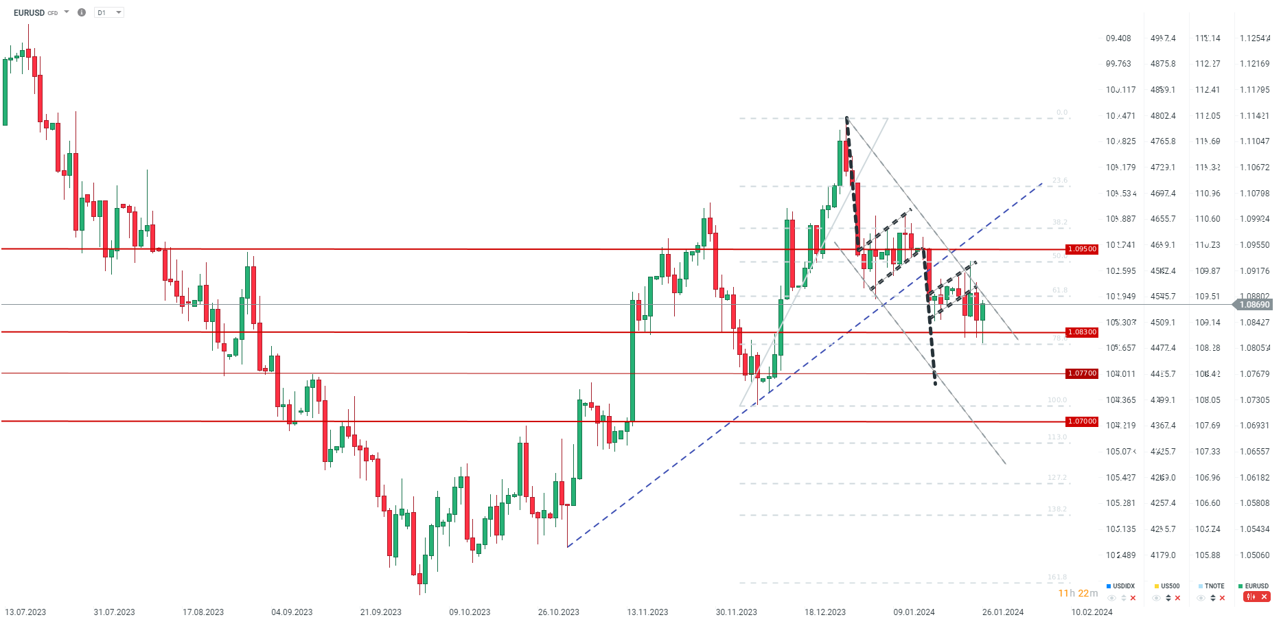 La paire EURUSD a clairement rebondi depuis le début de la session européenne, même si, dans un premier temps, elle a testé des zones proches du niveau de 1,0800. Le niveau de résistance clé se situe autour du retracement de 61,8 % et de la limite supérieure du canal de tendance à la baisse. Si l'inflation PCE est inférieure aux prévisions, une hausse au-dessus de 1,0900 n'est pas à exclure. Ce niveau est essentiel du point de vue de la tendance de la paire EURUSD la semaine prochaine.