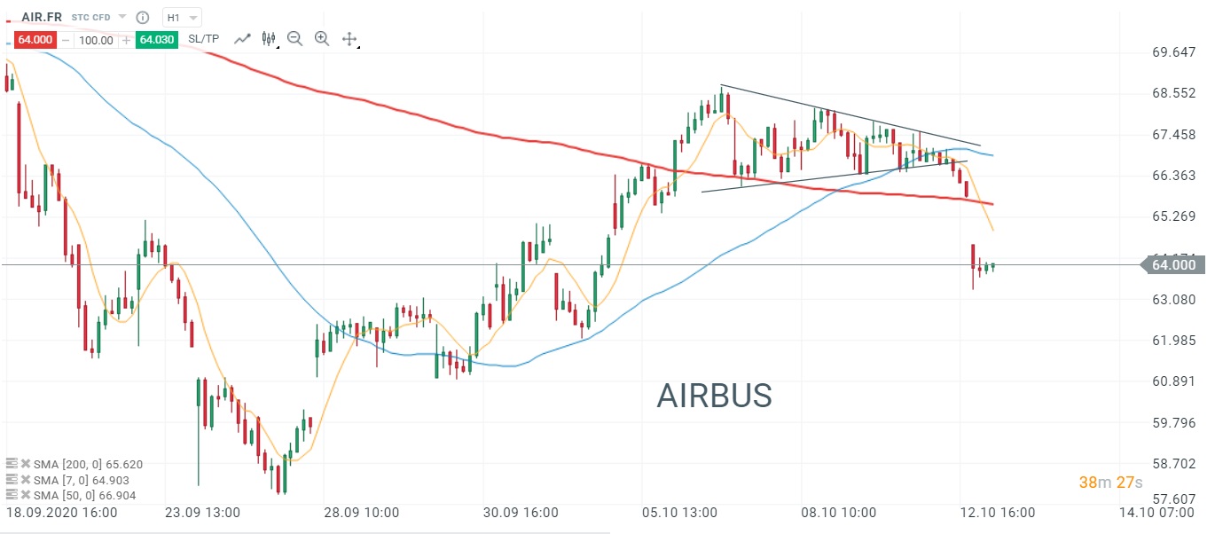 Airbus (AIR.FR) tombe de haut et vient s'écraser sur le support à 64 euros après être sorti par le bas de son triangle symétrique. A noter que le gap d'ouverture, que l'on qualifira de gap de ruputre, a permis de passer sous la SMA 200 (ligne rouge).