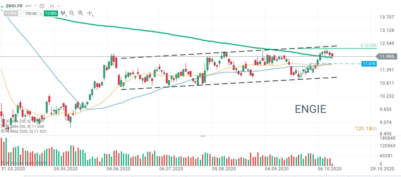 L’action Engie (ENGI.FR) a atteint la borne supérieure de son canal haussier et teste actuellement sa moyenne mobile à 200 périodes. Source : xStation5