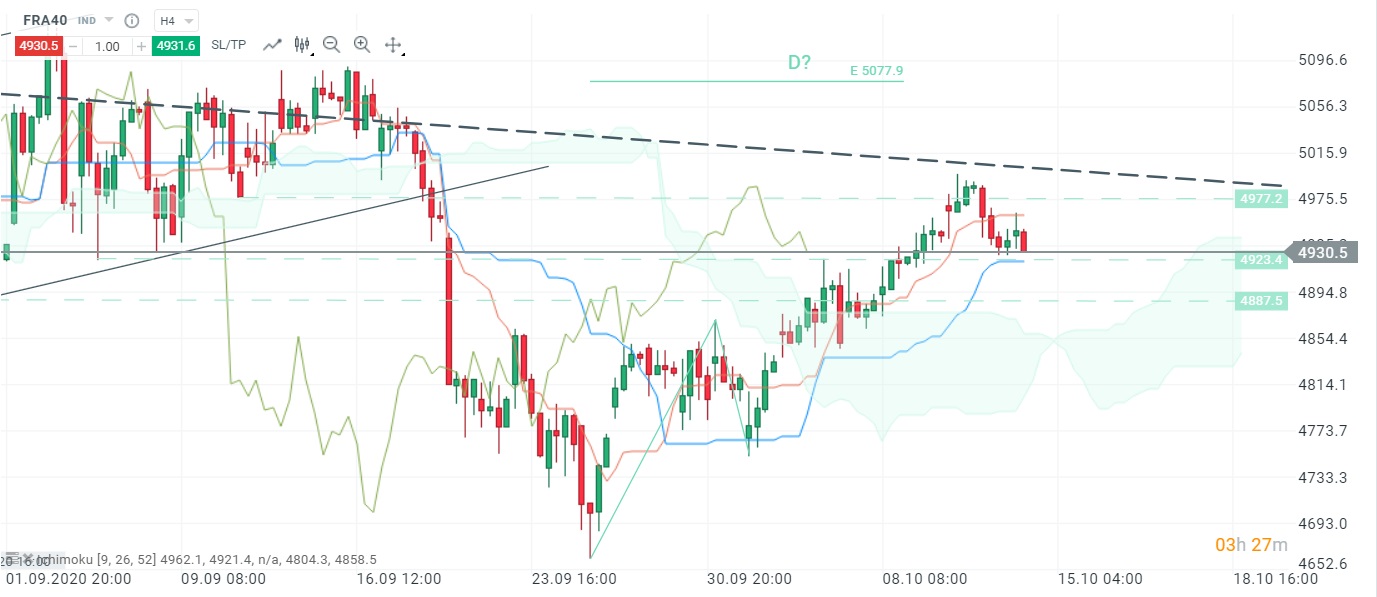 Après s’être replié aux alentours de l’oblique baissière, le FRA40 tente de rebondir au-dessus de sa Kijun en H4, correspondant au creux du 4 septembre. L’indice français devra parvenir à passer au-dessus de l’oblique pour envisager une poursuite de la hausse vers les 5077 pts. En cas de passage sous le Kijun à 4923 pts, les cours pourraient s’attaquer au nuage si les 4 885 pts ne parviennent pas à stopper la baisse. Source : xStation5