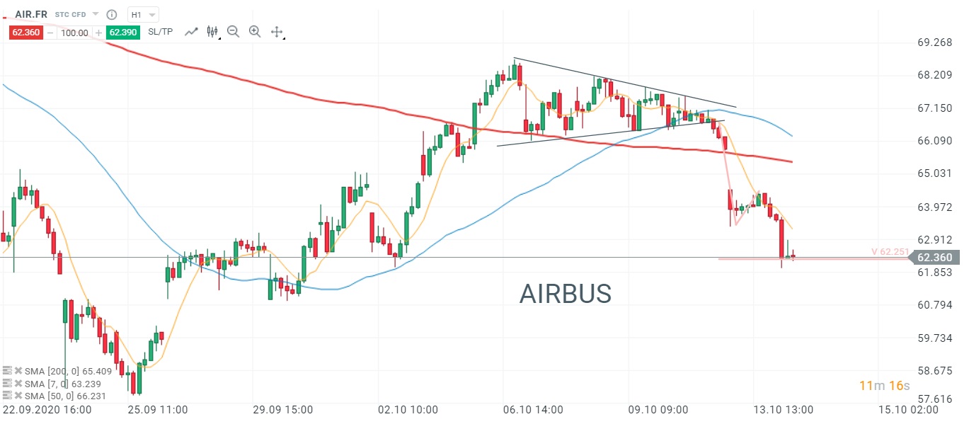 Airbus (AIR.FR) s’est fortement replié sous sa moyenne mobile à 200 heures et se stabilise sur son support à correspondant à la projection V de la baisse amorcée à la sortie du triangle. Source : xStation5