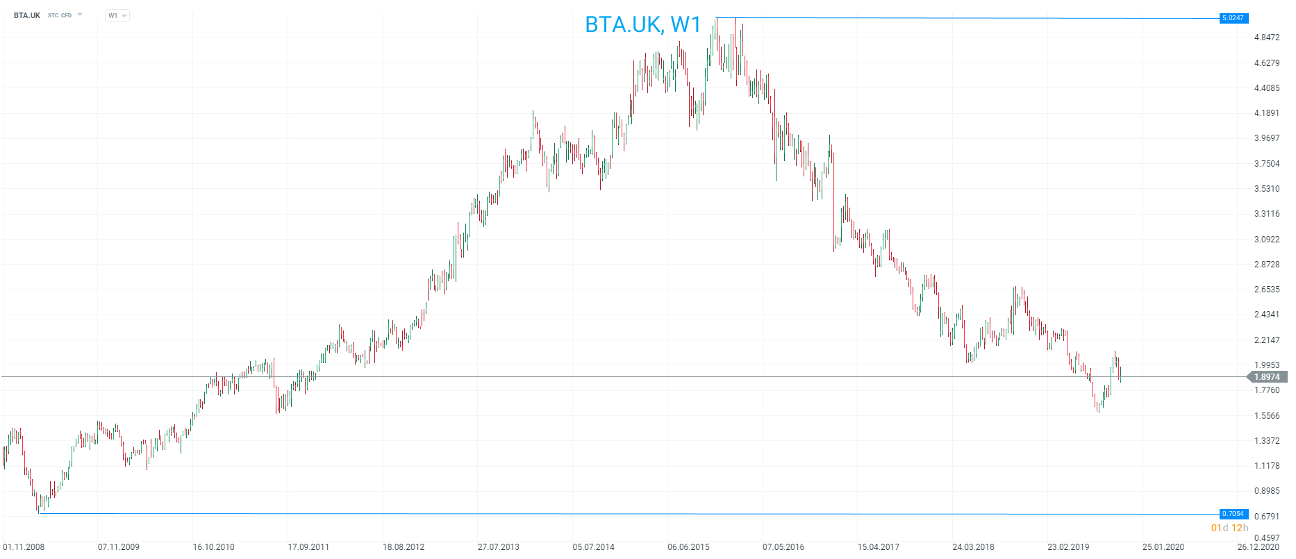 Les actions de BT sont dans une tendance baissière depuis près de 4 ans maintenant, après avoir culminé juste au-dessus de la barre des 5 £ vers la fin de l'année 2015/16. Le stock a perdu plus de 60% de sa valeur au cours de cette période. Source: xStation