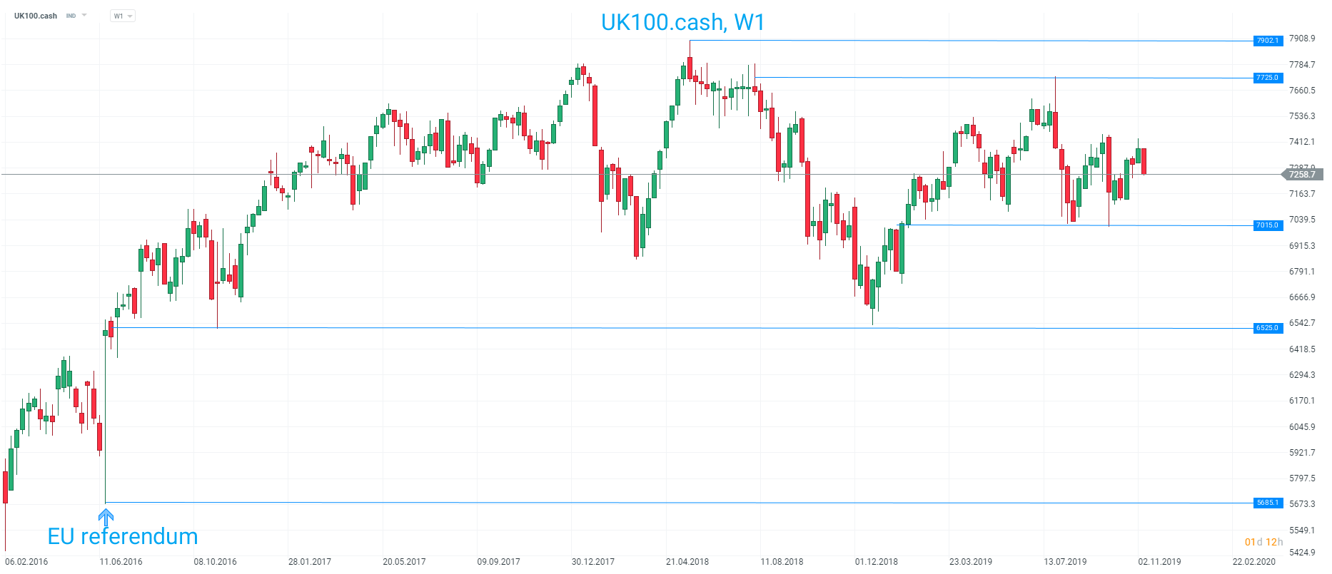Les actions britanniques sont en grande partie liées depuis trois ans et demi depuis le référendum sur l’UE. La fourchette a été encore plus étroite ces derniers mois, le marché étant limité à environ 10% depuis le début de février 2019. Source: xStation
