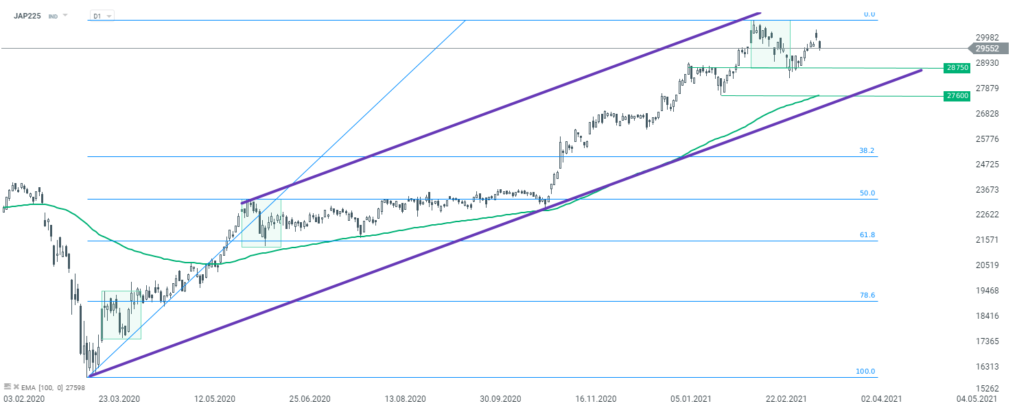 Le JAP225 n'a pas réussi à atteindre ses récents sommets et est repassé sous la barre des 30 000 points après la révision de la politique de la BoJ. Comme la BoJ n'achètera plus d'ETF Nikkei 225, l'indice perdra un soutien important qui est intervenu pour acheter les dips pendant la correction. Le JAP225 pourrait entamer une phase de sous-performance. Si la baisse se poursuit, le support à surveiller à court terme se trouve à la limite inférieure de la géométrie de marché 1:1 (28 750 pts). Si cela ne suffit pas à arrêter les vendeurs, le prochain support peut être trouvé dans la zone des 27 600 pts, où se trouvent la moyenne mobile de 100 séances et la limite inférieure du canal ascendant.