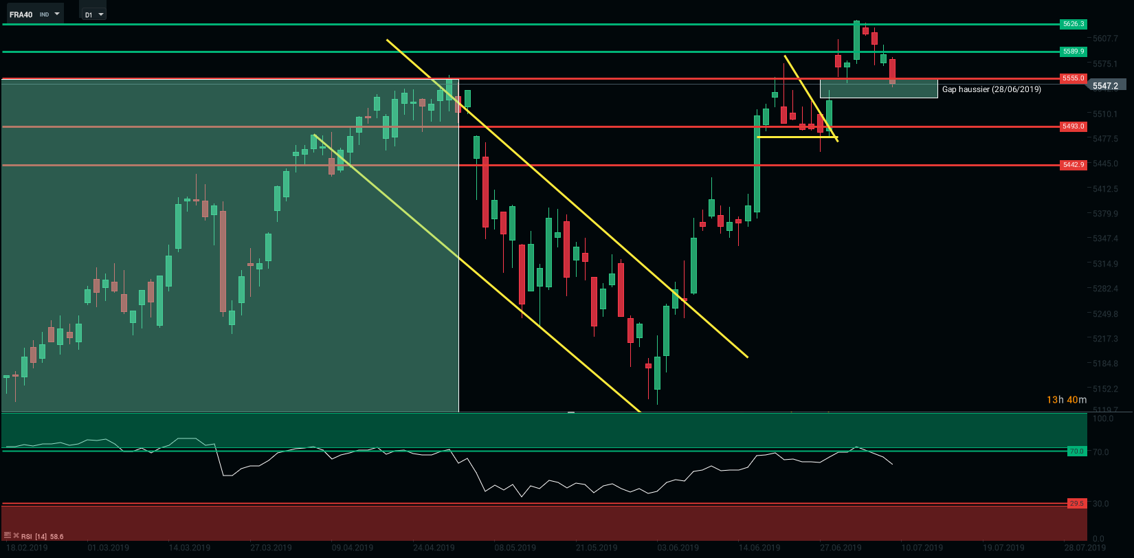En effet, au vue des niveaux sur lesquels les indices boursiers naviguent il devient très délicat d’avoir une position acheteuse sur un horizon moyen terme. Ce que les investisseurs craignent plus que tout, c’est une forte chute des marchés obligataires. Cette forte chute entrainerait un effondrement des marchés actions et un durcissement du financement de l’économie. Morgan Stanley, a réduit son exposition aux marchés actions. Pour l’heure, le CAC40 s’est affranchi à la baisse des 5 550 points. Les vendeurs tentent de combler le gap haussier formé le 28 juin 2019.