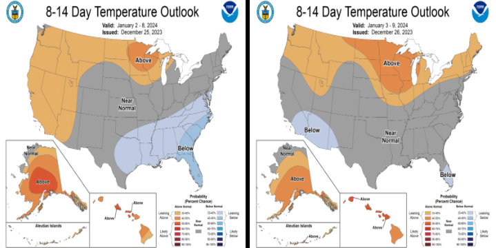 Les prix du gaz naturel américain (NATGAS) sont en hausse de plus de 3 % aujourd'hui. De nouvelles prévisions météorologiques suggèrent qu'une période de températures supérieures à la moyenne aux États-Unis pourrait toucher à sa fin. Les nouvelles prévisions indiquent des températures proches de la normale sur environ la moitié des États-Unis avec des températures supérieures à la moyenne attendues dans le nord et des températures inférieures à la moyenne observées dans le sud-ouest ainsi qu'en Floride. Cela suggère que la consommation de gaz naturel pourrait augmenter et s'aligner davantage sur les moyennes pour la période, étant donné que la demande de chauffage augmentera.