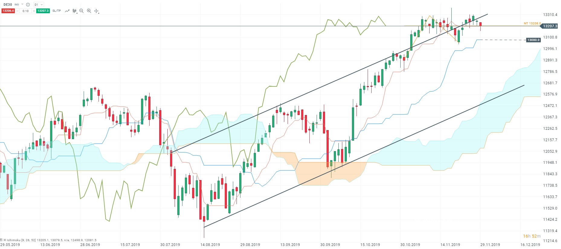 L’Europe cède à la prudence et le DAX a tenté de caser un important support, les 13200 points. La cassure de ce niveau est un signal d’alerte, et pourrait renvoyer le DAX sur sa Kijun journalière à 13080 points. Pour l’heure, le repli est limité par manque de volume mais pourrait s’intensifier si les craintes se confirment. Le Dax est susceptible de retracer en invalidant la cassure pour se stabiliser légèrement au-dessus, mais il faut garder à l’esprit qu’une validation du franchissement entrainerait une baisse plus conséquente. Seule une clôture sous ce niveau confirmerait ce signal d’alerte. De plus, nous avons pris connaissance des chiffres des ventes au détail pour le mois d’octobre, ressortis inférieurs aux attentes, ce qui pourrait être un vecteur baissier pour l’indice allemand.