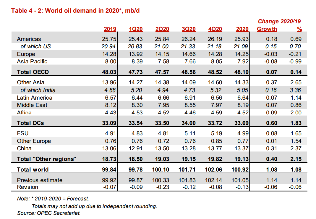 Extrait du tableau de la prévision de la demande mondiale de pétrole pour l’année 2020. Source : Rapport mensuel de l’OPEP du 11 septembre.