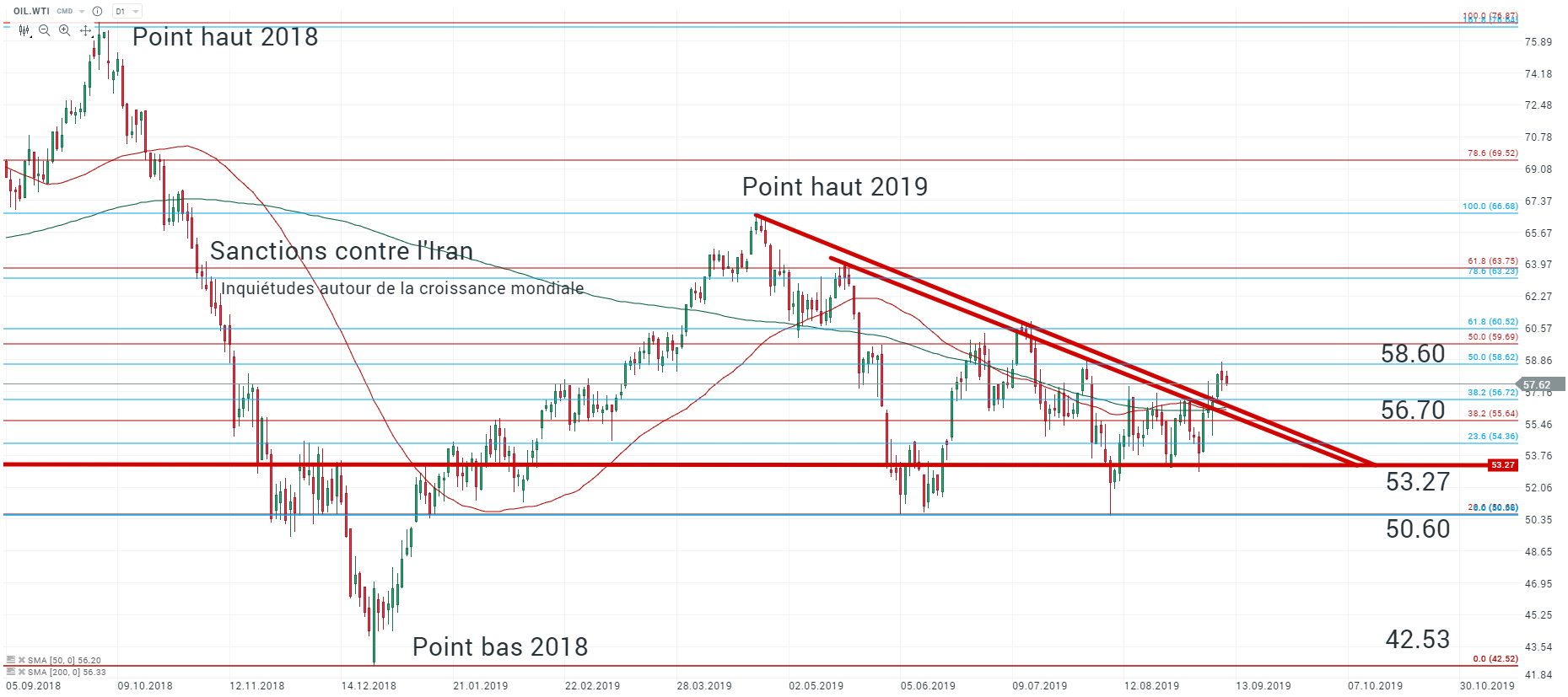 D’un point de vue technique, le rebond des cours du pétrole depuis début septembre a invalidé la figure chartiste dite triangle descendant (triangle matérialisé par la résistance oblique depuis le point haut de l’année 2019 - et par le support des 50.60 $). Les cours ne sont pas parvenus à s’affranchir de la zone de résistance intermédiaire des 56.70 $ (50 % des retracements de Fibonacci du mouvement baissier de l’année 2019).