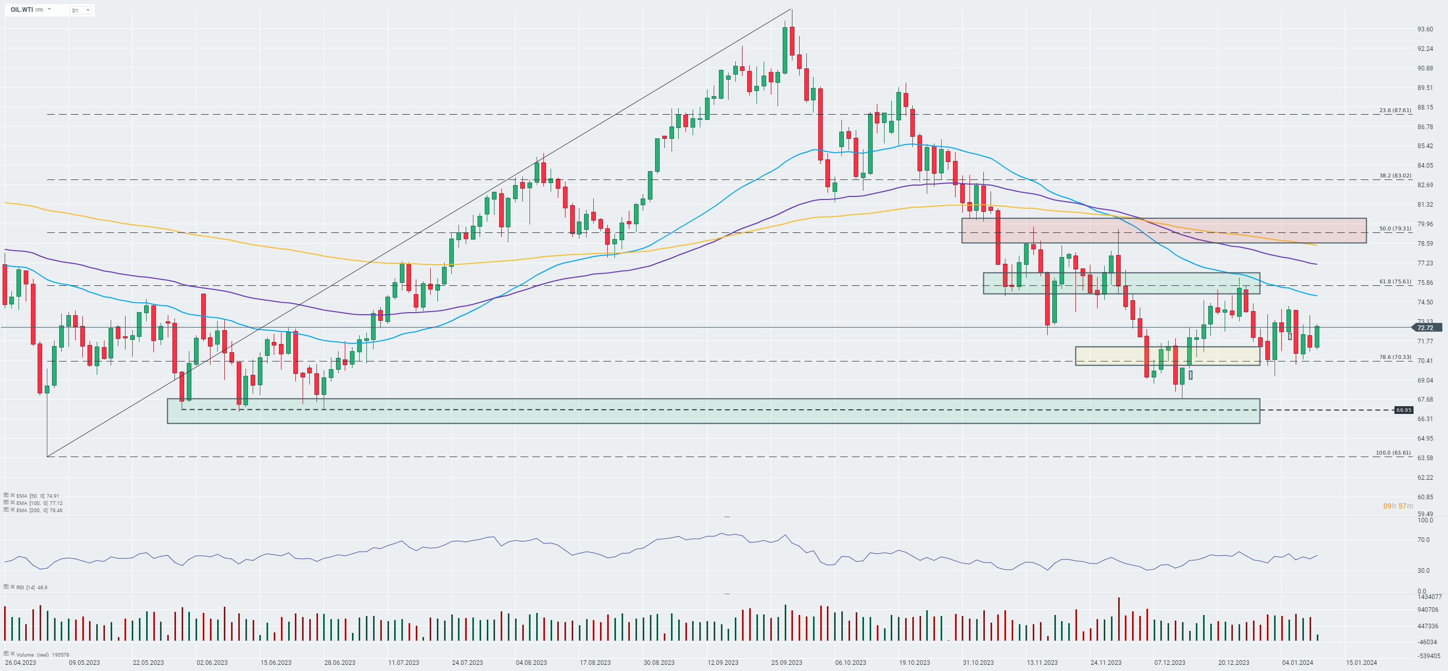 Le pétrole brut WTI se négocie actuellement près de la barrière des 73 dollars le baril et évolue dans un canal de consolidation relativement étroit depuis un certain temps. Sa limite inférieure est située en plus sur la structure du retracement Fibo 78,6% de la vague haussière initiée en mai 2023. La limite supérieure du canal mentionné pourrait à moyen terme se situer dans la région de l'EMA exponentielle de 50 jours (courbe bleue) et du Fibo 61,8%.