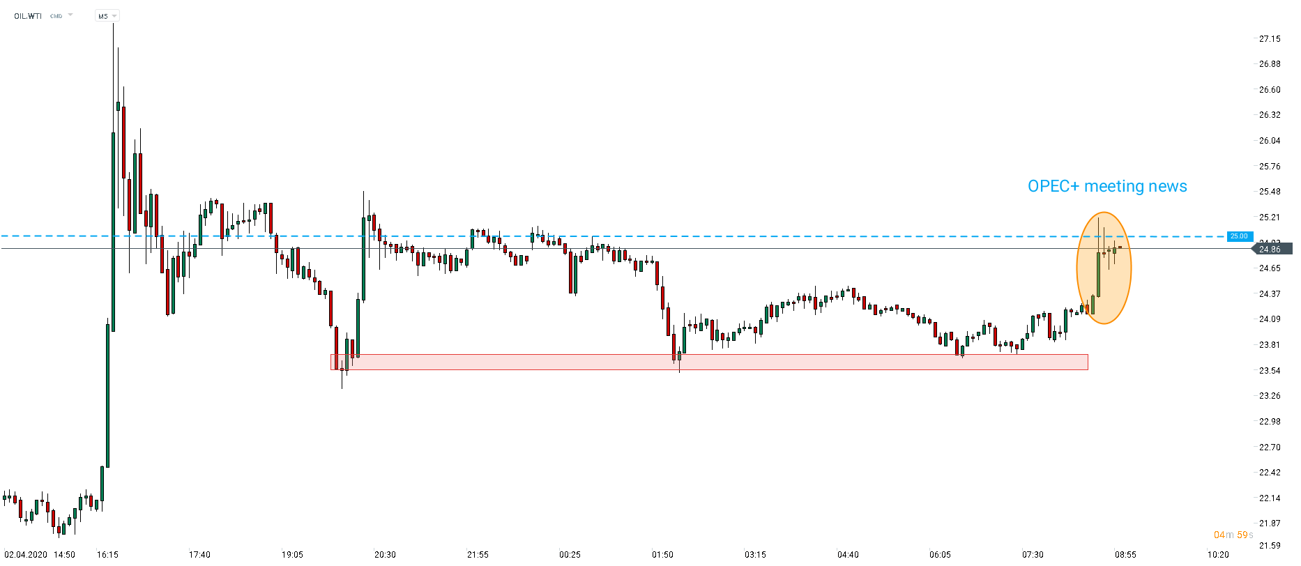 OIL.WTI a fait un bond et a testé la barre des 25 dollars. Cependant, le cours reste encore loin des sommets atteints hier. Source : xStation5