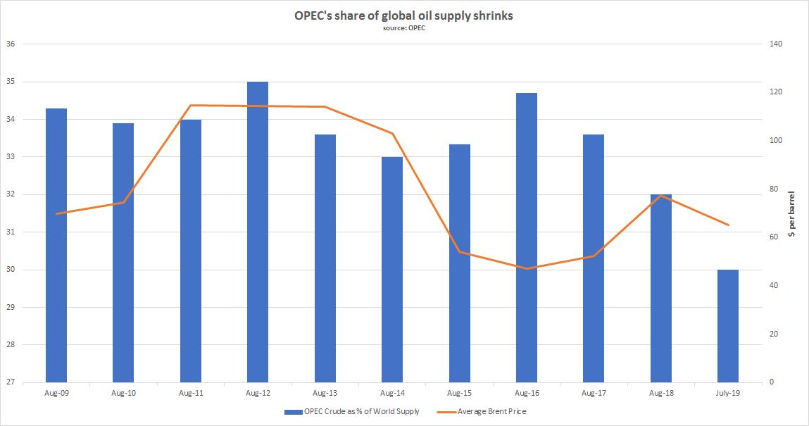 La part de l’OPEP concernant l’offre de pétrole mondial continue de diminuer. Ceci notamment au profit de la production américaine. Source : Opec