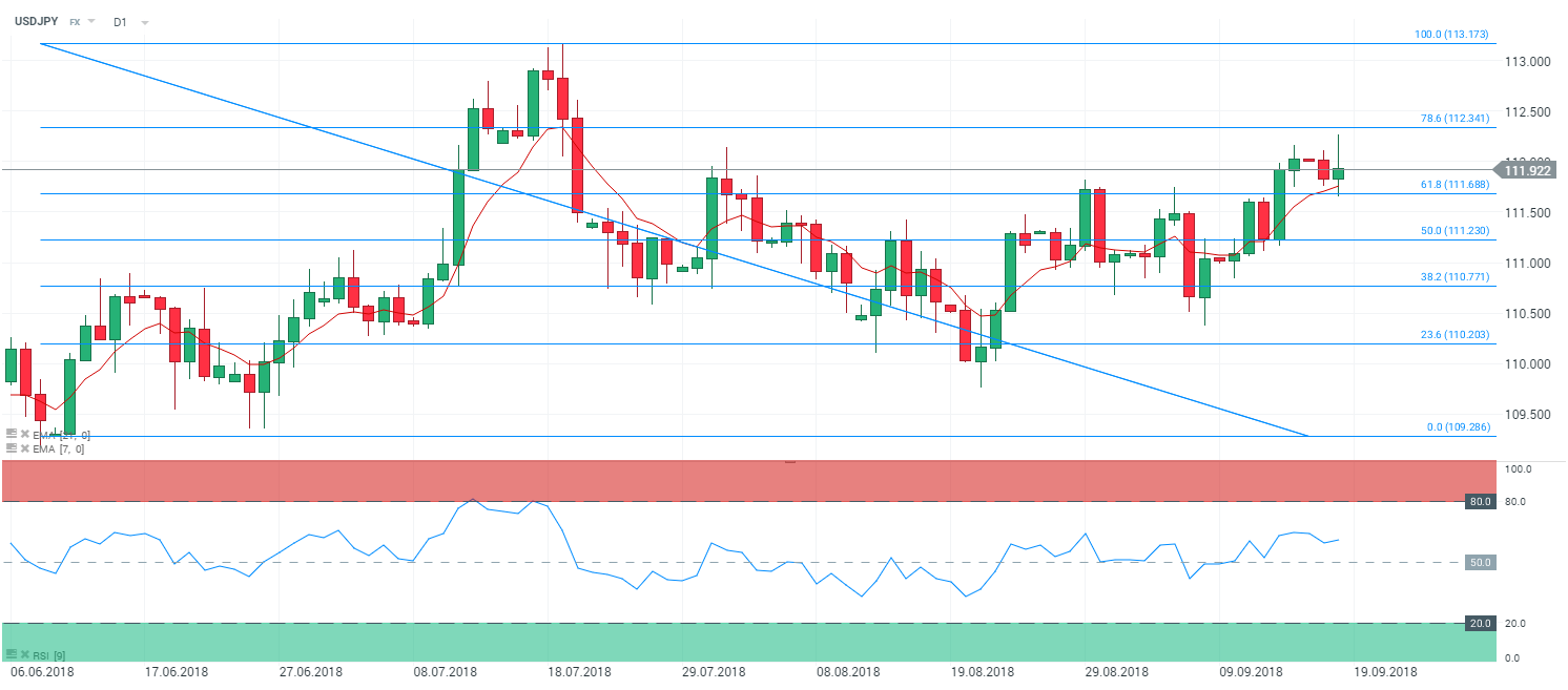 Les prix sont soutenus par les moyennes mobiles à 7 et 21 périodes. Le RSI est orienté à la hausse à 61,9 points. Les prix ont confirmé une nouvelle zone de support sur le niveau des 111,70 Yen pour 1$ (correspondant aux 61,8% des retracements de Fibonnaci).