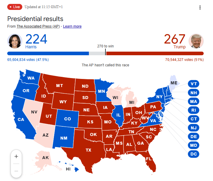 Donald Trump a actuellement 267 grands électeurs, tandis que Kamala Harris en compte 214, avec un minimum de 270 nécessaires pour devenir président.