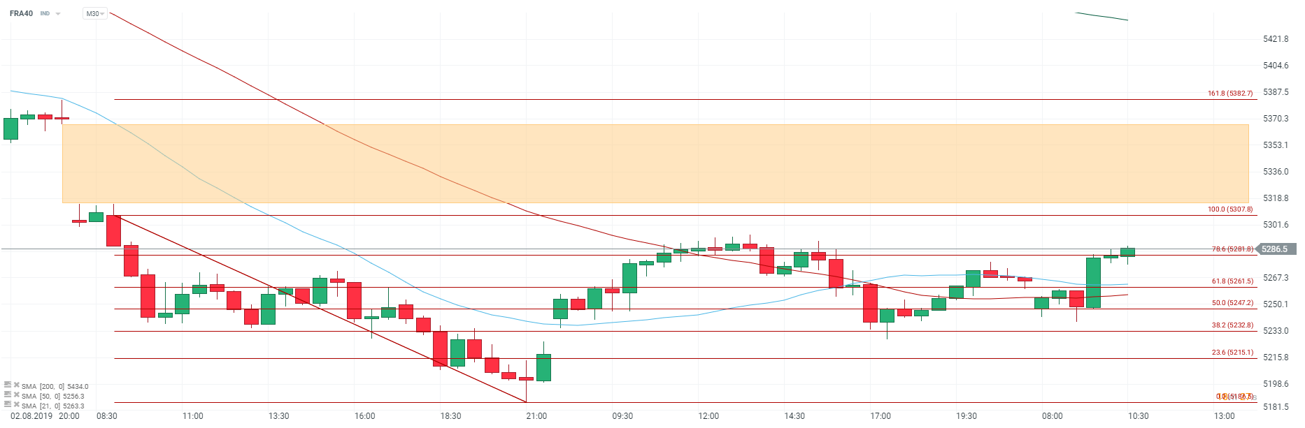 Les cours du CAC 40 évoluent autour de leur zone de résistance à 5280 points correspondant aux 78.6 % des retracements de Fibonacci. Source : xStation5.