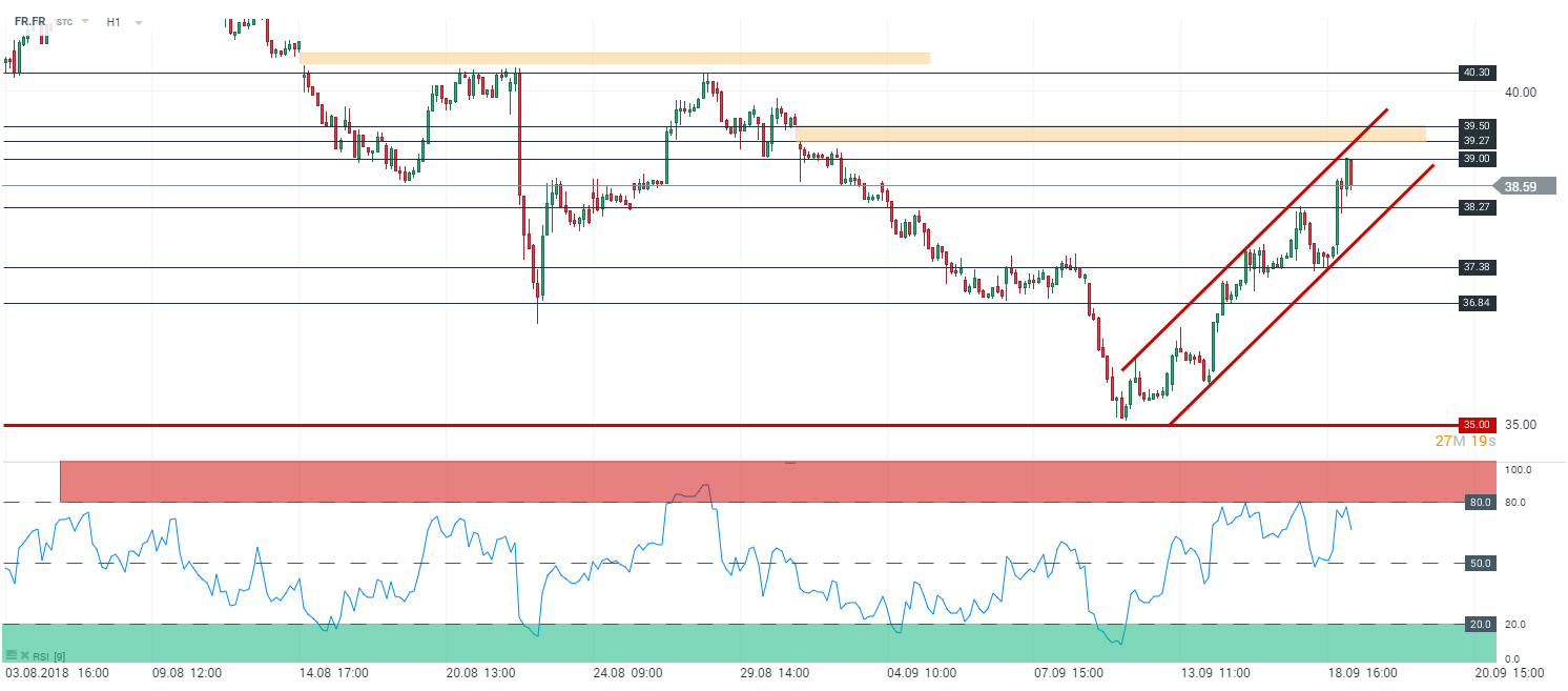 En unité de temps horaire (H1), le titre Valeo (FR.FR) évolue en tendance haussière au sein de son canal haussier identifié depuis 5 séances. Les cours se sont affranchis de leur zone de résistance située sur le niveau des 38,27 € et sont en train de tester ce dernier comme nouveau support. Le RSI se situe proche de sa zone de « sur achat » et s’oriente à présent à la baisse à 66,4 points. Nous serons donc haussier sur Valeo avec en ligne de mire le niveau des 39,50 €, correspondant au comblement du gap formé lors de la séance du 31 août.