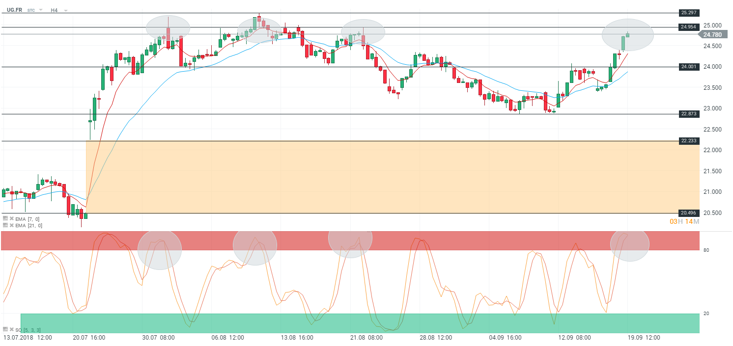En unité de temps quatre heures (H4), le titre Peugeot (UG.FR) évolue en tendance haussière. Les prix sont soutenus par les moyennes mobiles à 7 et 21 périodes. Les prix se dirigent sur la borne haute de la séance de range identifiée depuis la séance du 1er août. Le RSI est situé dans sa zone de « sur achat » à 80,2 points. Autre signe de surchauffe, le stochastique évolue également dans sa zone de « sur achat » et la moyenne rapide tend à croiser la moyenne lente de l’oscillateur. De plus, le gap formé à la suite des excellents résultats financiers de l’entreprise n’a toujours pas été comblé. Dans ce contexte, nous avons un biais baissier en direction des 24 € à titre conservateur, puis en direction des 23 € avec une approche plus agressive.