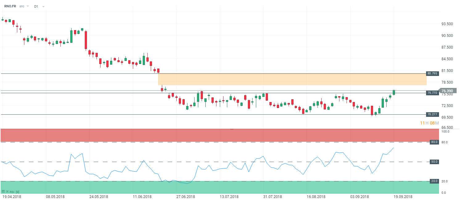 En unité de temps journalière (D1), le titre Renault (RNO.FR) évolue en tendance haussière depuis 5 séances. Les cours sont même parvenus à s’affranchir de leur zone de range située entre 70,27 € et 75,77 €. Le RSI est située proche de sa zone de « sur achat » à 70,9 points. Dans ce contexte, nous serons haussier sur le titre Renault, avec en ligne de mire le niveau des 80,795 € - correspondant au comblement du gap formé lors de la séance du 21 juin.