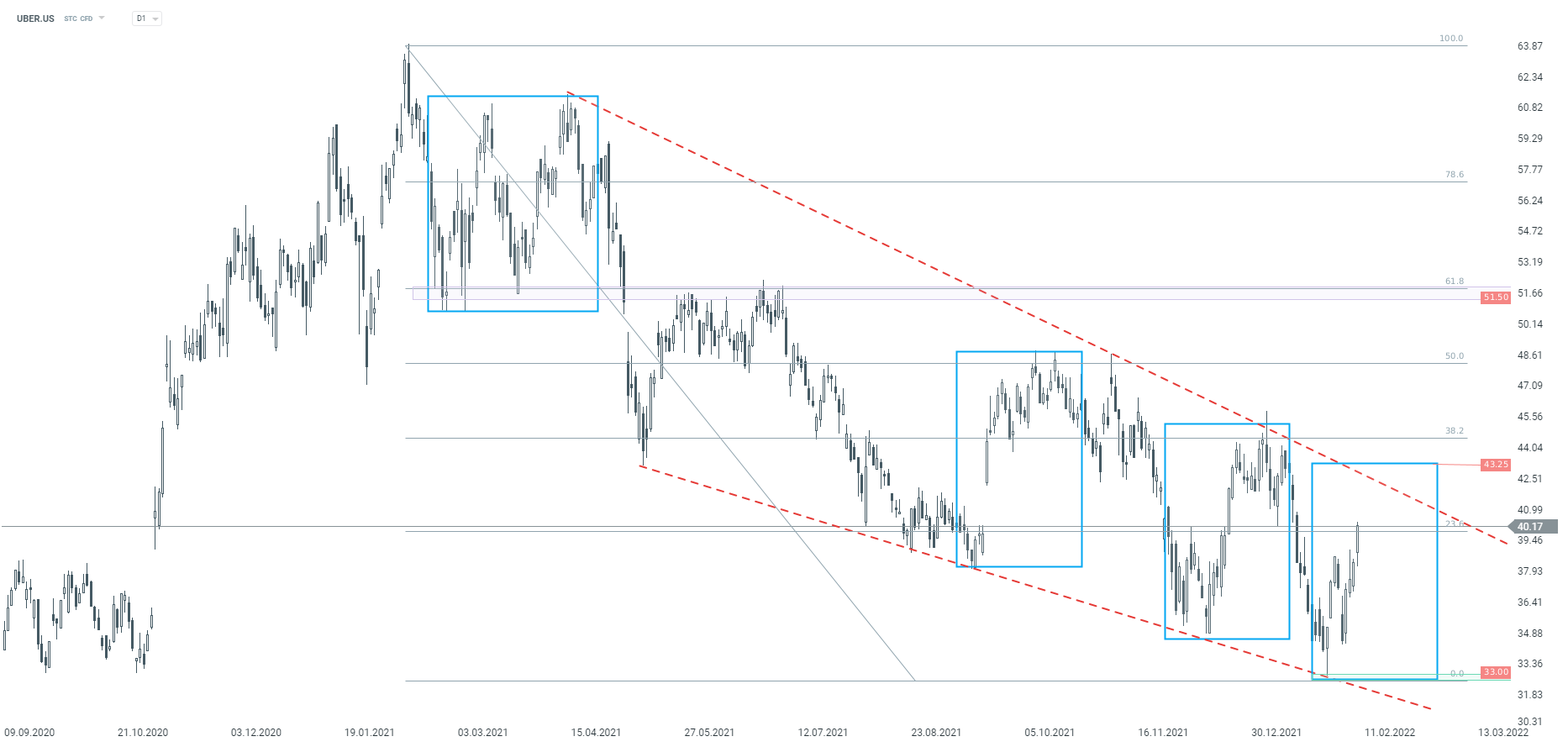 En examinant le graphique d'Uber Technologies (UBER.US) à l'intervalle D1, nous pouvons constater que l'action évolue dans une formation en biseau descendant depuis environ un an. Le cours de l'action a rebondi sur la limite inférieure de la formation au tournant des mois de janvier et février. L'action a gagné environ 20 % depuis le début du mois et s'échange encore 5 % plus haut en pré-marché d'aujourd'hui. Il semble qu'un test de la limite supérieure de la formation en biseau susmentionnée sera effectué au début de la séance d'aujourd'hui. Si les acheteurs parviennent à le franchir, le prochain niveau de résistance à surveiller se situe à 43,25 $ et est marqué par la limite supérieure de la structure Overbalance.