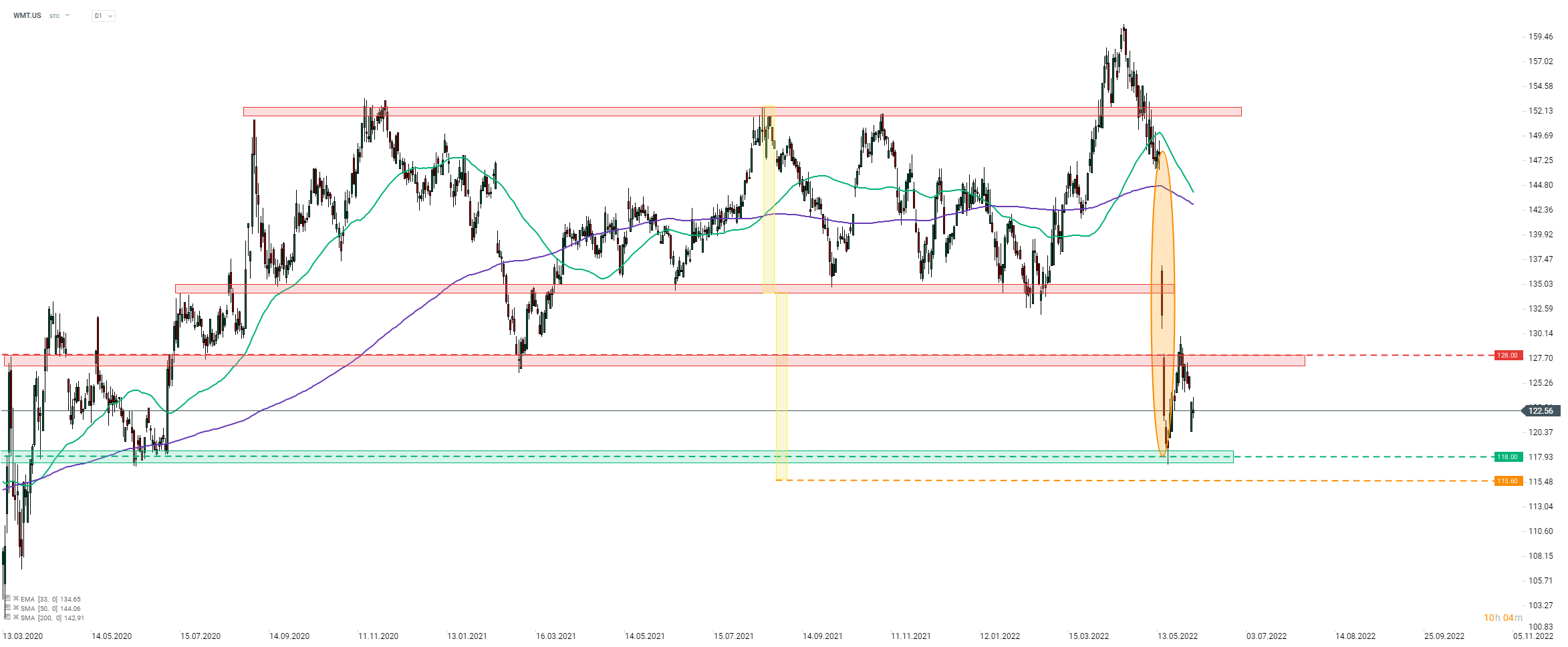 Les avertissements sur résultats publiés par les distributeurs américains après la publication des résultats du premier trimestre ont déclenché une très forte baisse du cours de l'action Walmart (cercle orange). Cette chute a été stoppée à la zone de support de 118 $, légèrement au-dessus du range classique de la cassure à la baisse de la fourchette de négociation depuis septembre 2020 (115,60 $). Le titre a tenté de se redresser un peu plus tard, mais la reprise a été interrompue par la résistance de 128 $. Ces deux zones sont des niveaux clés à surveiller désormais et une période d’évolution en range n'est pas à exclure.