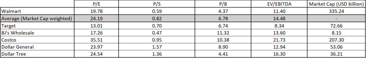 Cependant, comme il s'agit d'un problème à l'échelle du secteur, nous devrions examiner comment Walmart se compare aux pairs de l'industrie et si cela pourrait être considéré comme un bon investissement ou non. Certains des multiples d'actions les plus populaires ont été présentés dans le tableau ci-dessous pour Walmart ainsi que 5 de ses concurrents du marché américain. Chaque multiple de Walmart est comparé à la moyenne pondérée en fonction de la capitalisation des valeurs de Walmart et de ses 5 pairs. Comme on peut le voir, Walmart semble "moins cher" que la moyenne des pairs dans chaque cas. Cependant, alors que la valorisation de Walmart semble plus favorable que celle d'un groupe de pairs, les investisseurs doivent garder à l'esprit qu'une inflation élevée décourage les clients de faire leurs achats autant qu'avant et que, par conséquent, les perspectives pour les trimestres à venir sont quelque peu faibles.