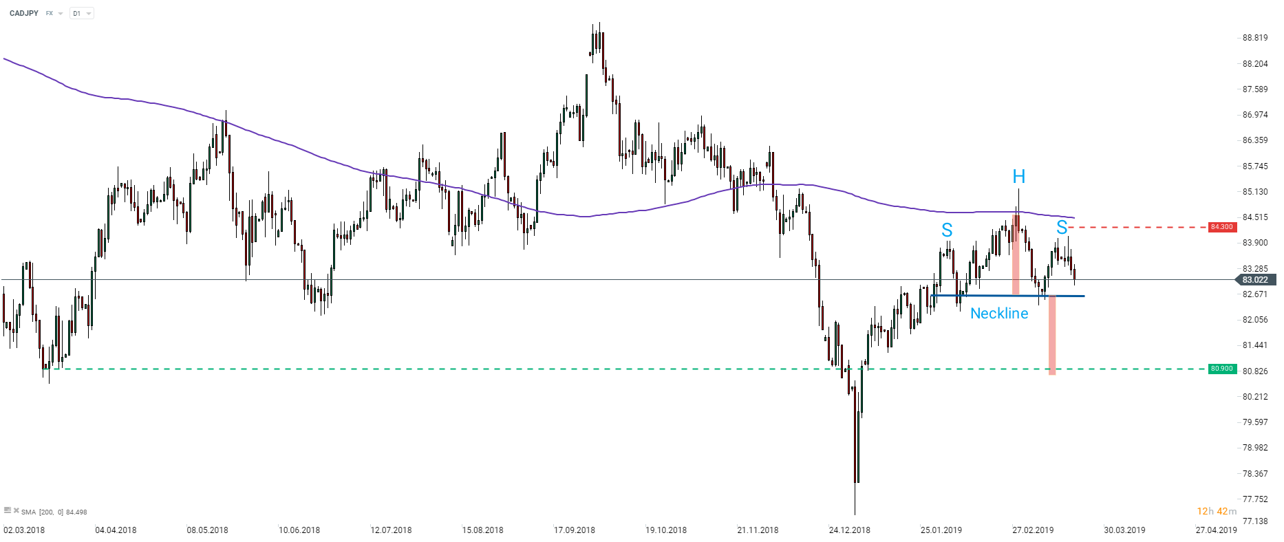 Le rallye sur la paire CADJPY initié fin 2018 a été stoppé par la moyenne mobile à 200 périodes (ligne violette sur le graphique ci-dessus). Certains éléments laissent à penser qu’une baisse à court terme de la paire pourrait se produire. En effet, lorsque nous examinons les 3 derniers sommets nous pouvons voir assez clairement la formation d’une « épaule-tête-épaule ». Lors de la dernière séance, le FOMC a exclu la possibilité d’une hausse des taux en 2019.Il est peu probable que la politique de la Banque du Canada diverge de celle de la Fed. L'absence de progrès dans les négociations commerciales et le report de la réunion Trump-Xi ont provoqué un regain d’incertitudes sur les marchés. Ainsi, il y a de forte chance que la figure de retournement susmentionnée atteigne ses objectifs à court terme. Nous recommandons de vendre le CADJPY avec un objectif de 80,900 et un ordre « stop pertes » placé à 84,300.
