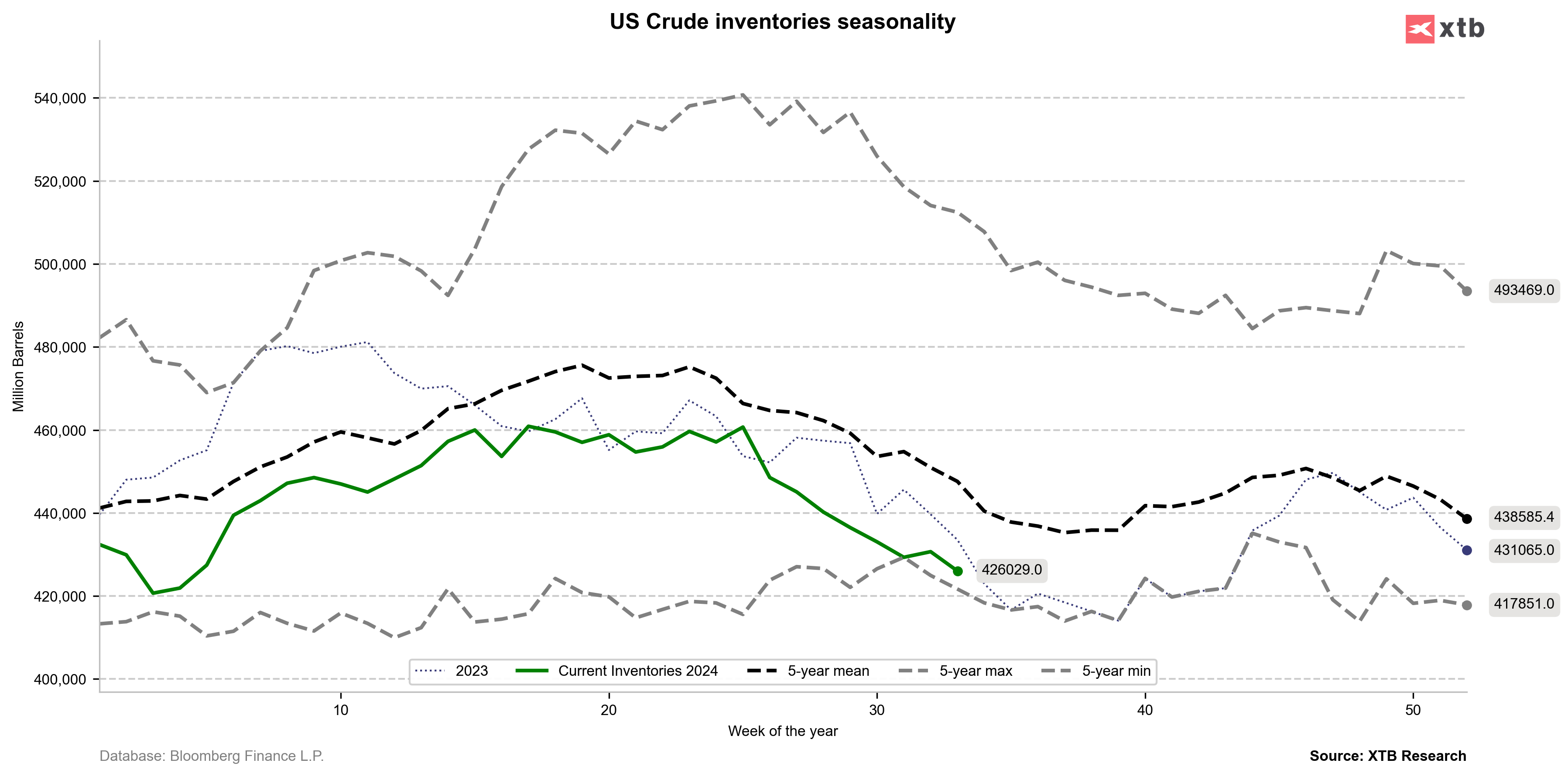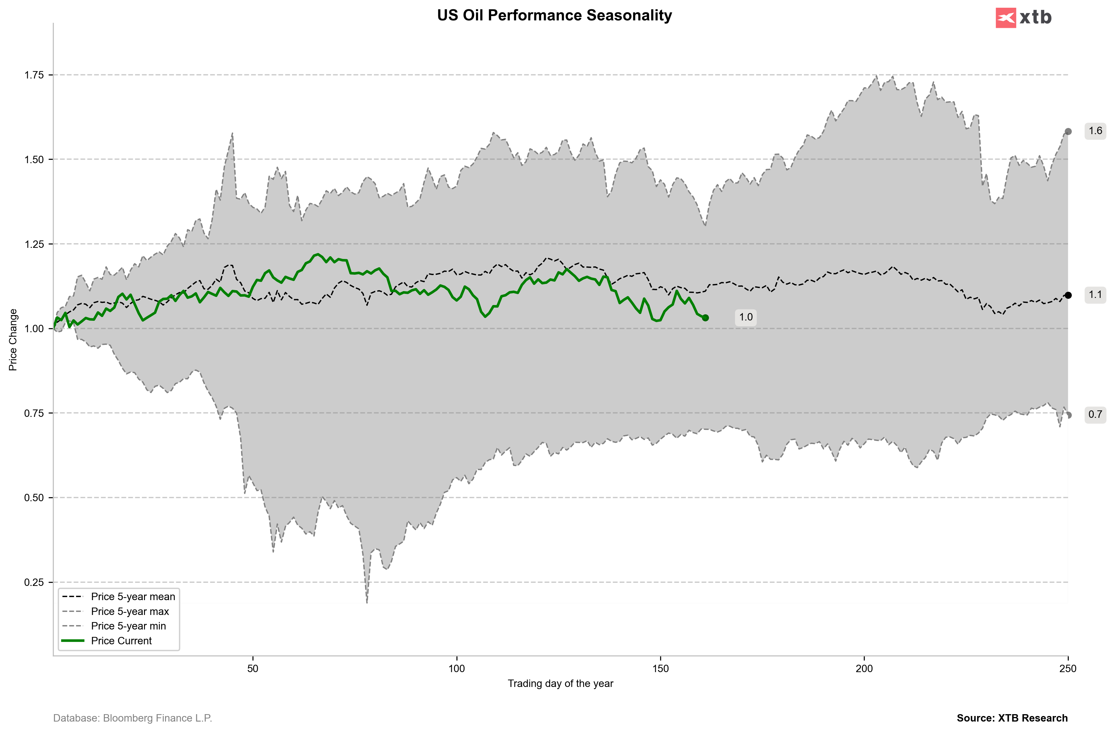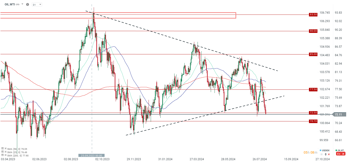 Les stocks recommencent à baisser et sont déjà proches de leur niveau le plus bas depuis cinq ans. Un creux local des stocks pourrait être possible dans quelques semaines. Source: Bloomberg Finance LP, XTB Bloomberg Finance LP, XTB