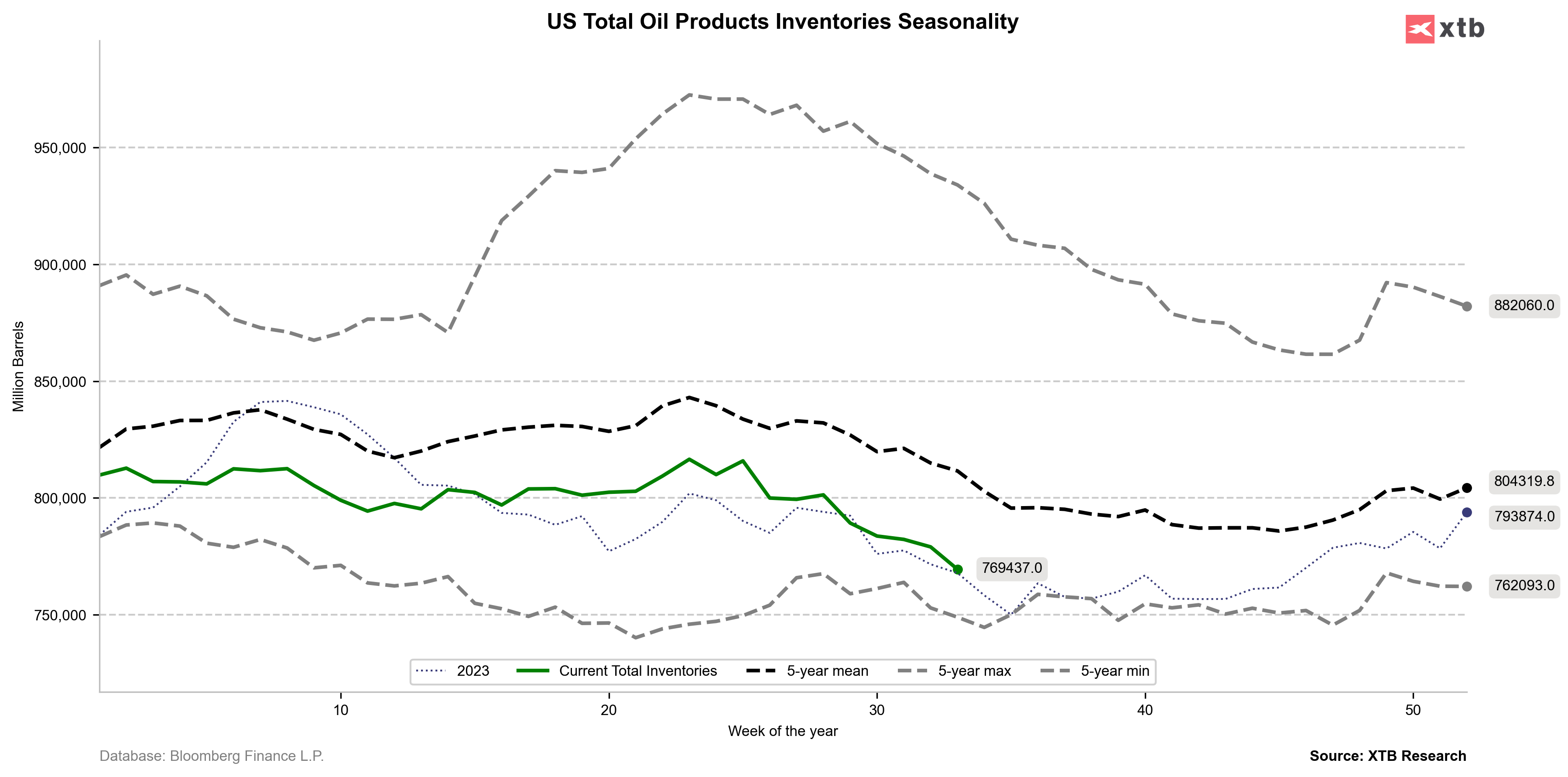 Les stocks de produits pétroliers sont retombés à des niveaux proches de ceux de l'année dernière. Malgré cela, les prix sont inférieurs à ce qu'ils étaient il y a un an. Source: Bloomberg Finance LP, XTB Bloomberg Finance LP, XTB