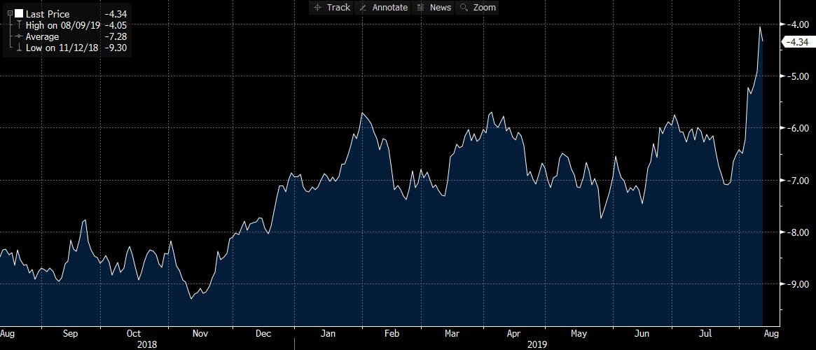 Selon Baker Hughes, le nombre d’appareils de forage pétrolier et gazier aux Etats-Unis a diminué de 8 la semaine passée. En effet, selon le rapport publié vendredi, sur 1 an (comparé au 10 août 2018) le nombre d’appareils de forage a diminué de 123. Cependant, la production de pétrole aux Etats-Unis reste stable aux alentours de 12 millions de barils par jour (soit une hausse de 1 millions de barils par jour par rapport à la même période l’année dernière). Au 2 août, la production de pétrole s’établit à 12.3 millions de barils par jour (soit une hausse de 100,000 barils par jour sur la semaine).