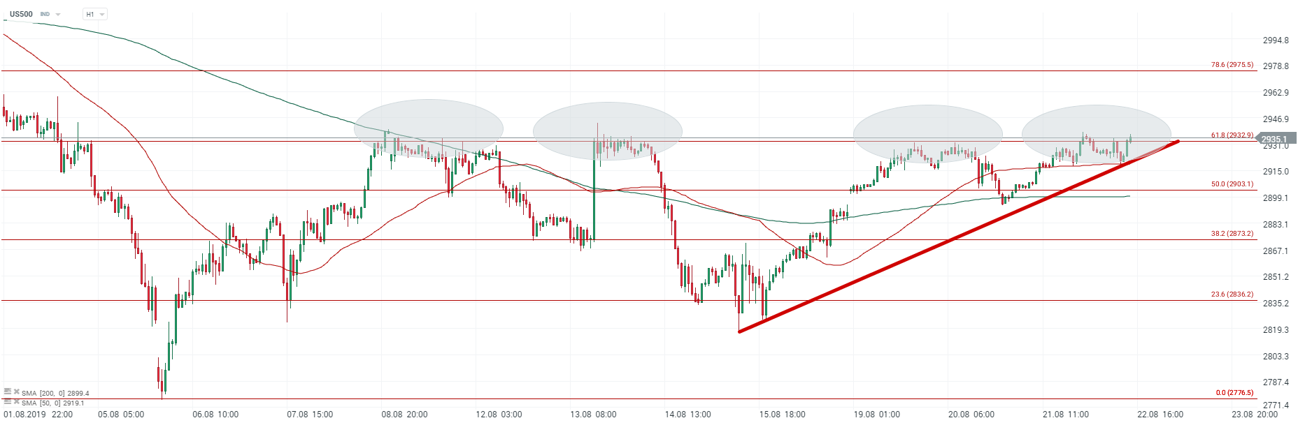 L’indice S&P500 teste pour la quatrième fois sa zone de résistance majeure autour des 2940 points. Cette zone correspond aux 61.8 % des retracements de Fibonacci. Les cours évoluent au sein d’un triangle ascendant. Source : xStation5.