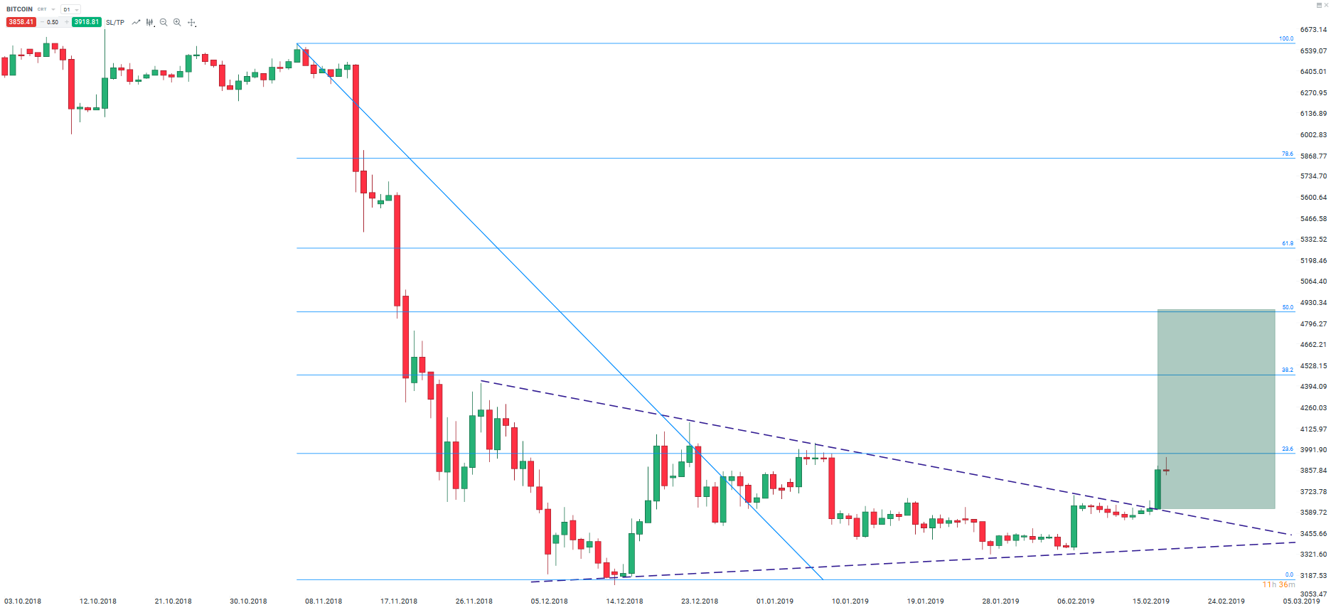 Enfin, jetons un coup d'œil à l'instrument que bon nombre de personne ont oublié, le Bitcoin. Le prix de la plus grande crypto-monnaie a connu deux hausses, ce qui, compte tenu de la liquidité médiocre récente du marché, ouvre la voie à une tendance de plus long terme. En regardant le graphique ci-dessus nous notons que la situation semble plus favorable aux « acheteurs ». Hier, les prix ont dépassé la limite supérieure du triangle, la voie vers le niveau des 50% des retracements de Fibonacci semble ouverte. Cependant, les acheteurs devront casser la barre des 4 000 $, soit les récents plus hauts. L’aspect psychologique peut jouer un rôle essentiel à cet égard, comme c’était le cas pour la majeure partie de l’année précédente.
