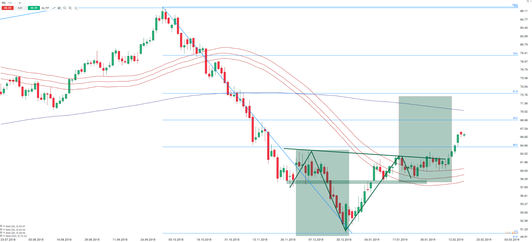 Le pétrole est un autre marché en plein essor grâce à l’amélioration de l’atmosphère sur le plan commercial. D'un point de vue fondamental, les prix du pétrole brut devraient repartir à la hausse. Les perturbations de l'offre au Venezuela et les réductions de production saoudienne en sont les principales causes. Le Brent a franchi à la hausse la « ligne de cou » de la formation en « épaule-tête-épaule inversée ». Si l’on est puriste, on pourrait s’attendre à ce que le prix augmente retrouve le niveau des 72 $. Cependant, on ne peut exclure un retour vers la résistance récemment franchie, dans les jours à venir. De plus, les acheteurs doivent surmonter la moyenne mobile de 200 périodes qui fluctue actuellement autour des 70 $.