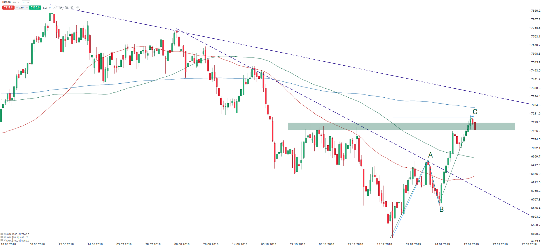 La progression de Wall Street continue, il n'y a pas de fin à l'horizon (pour le moment). C’est donc peut-être le bon moment pour jeter un coup d’œil sur d’autres indices bénéficiant de la reprise en cours. Le FTSE 100 du Royaume-Uni (UK100) en est un exemple. L'indice britannique ne semble pas impressionné par tous les dégâts causés par le Brexit. Bien entendu, un retrait sans accord nuirait aux entreprises britanniques, mais la faiblesse du sterling semble compenser cette incertitude. Le rebond du UK100 a commencé fin décembre 2018 et a pris la forme d'une correction en ABC, la vague C correspondant à 113% de la vague A (retracement Fibonacci). De plus, l’indice a quasiment retrouvé les sommets de la mi-novembre. Cependant, compte tenu de l'ampleur de la dernière impulsion à la hausse, on peut s'attendre à ce que les « vendeurs » (parieurs à la baisse) deviennent plus actifs dans cette zone de prix. Un cran au-dessus nous constatons la présence d’une moyenne mobile à 200 périodes pouvant servir de niveau de résistance.