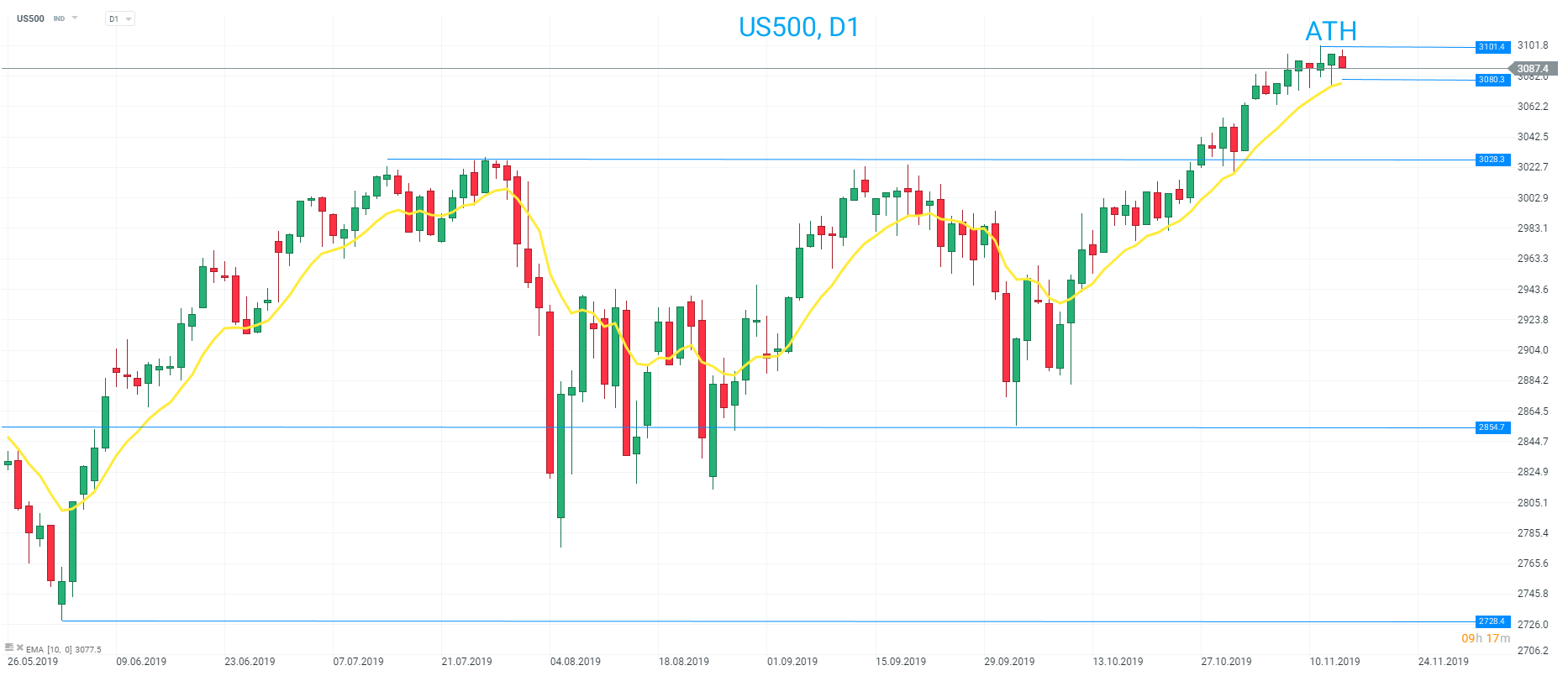 Les actions américaines ne sont pas loin des plus hauts historiques de tous les temps (ATH), les contrats à terme standardisés S & P500 s'échangeant autour de 0,5% par rapport à leur sommet record de 3101 en prévision de l'ouverture de la trésorerie. Le marché a clôturé au-dessus de ses 10 jours d'EMA pour un nombre incroyable de 25 sessions consécutives, ce qui témoigne de l'absence de repli significatif lors du récent rallye.Source: xStation