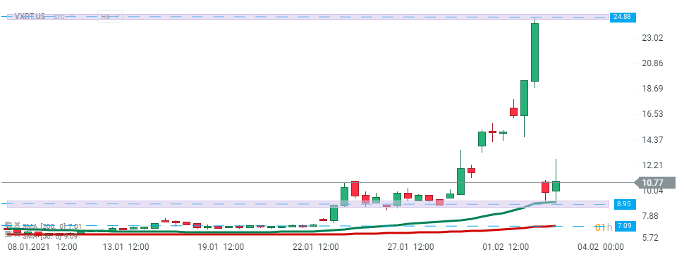 Vaxart (VXRT.US) a lancé la session d'aujourd'hui avec un gap prix baissier massif, mais les acheteurs ont réussi à reprendre la main sur le support à 8,95 $ qui est en outre renforcé par la SMA 50 (ligne verte). Source : xStation5