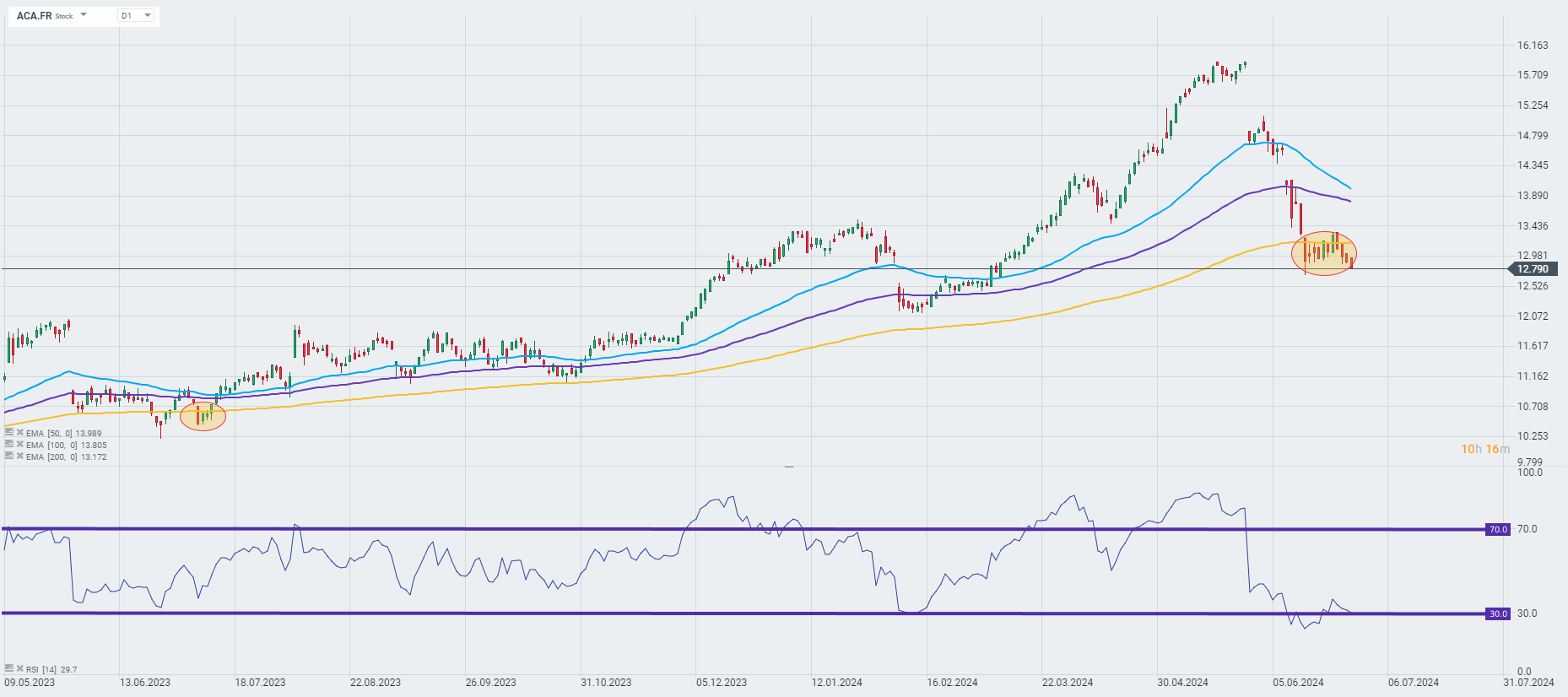 Les actions de Crédit Agricole (ACA.FR) ont chuté en dessous de la moyenne mobile exponentielle sur 200 jours (courbe dorée) pour la première fois depuis juillet 2023. Source : xStation