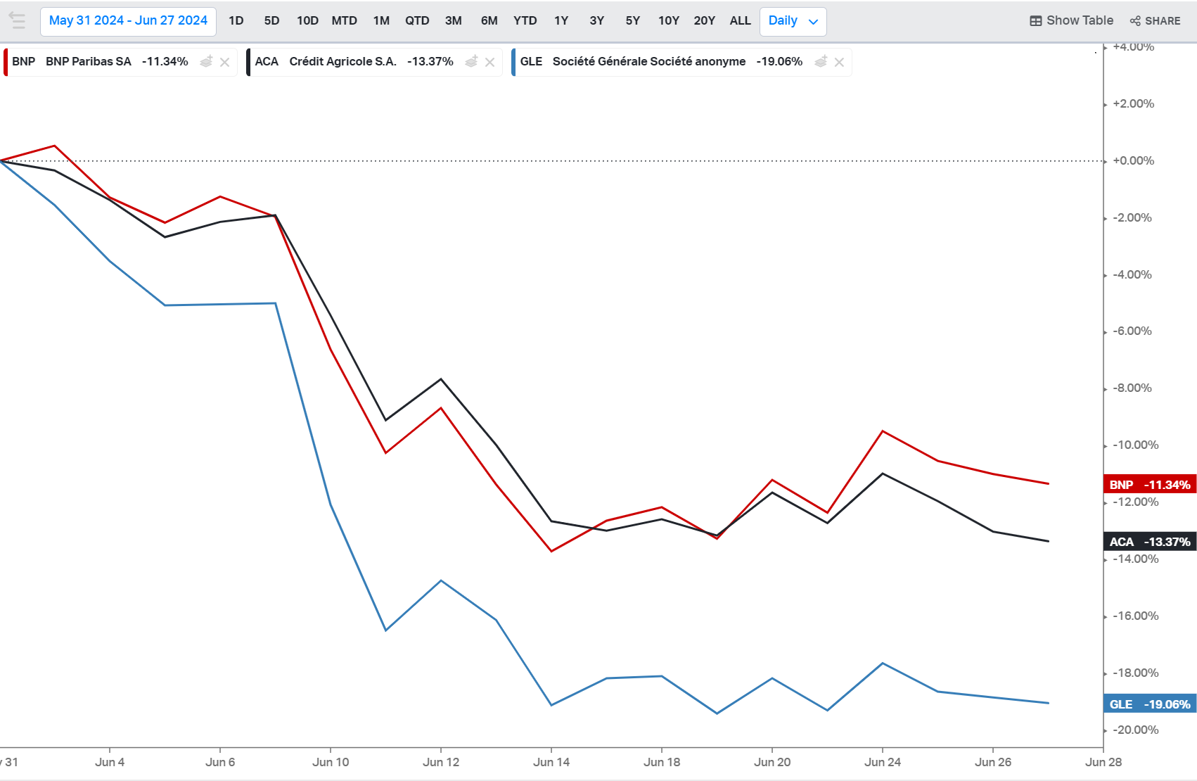 Dès dimanche, les Français se rendront aux urnes pour voter lors du premier tour des élections législatives. L'incertitude atteint des sommets, cependant, nous observons également une modération dans cette instabilité. Les craintes d'une augmentation des dépenses se stabilisent, soutenues par les signaux du Rassemblement National (RN) de Marine Le Pen, indiquant une orientation vers la responsabilité fiscale. Malgré cela, le secteur bancaire régional continue d'enregistrer des pertes à deux chiffres, et c'est ce secteur de l'économie européenne vers lequel les investisseurs tourneront leur attention dans les prochains jours.