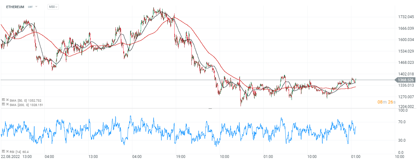 Ethereum, M30. Le SMA50 a franchi par le bas la SMA200 sur l'intervalle 30 minutes, ce qui confirme l'avantage des acheteurs à court-terme. La moyenne de 50 sessions est tombée en dessous de celle de 200 sessions le 15 septembre, après le succès de "The Merge". Au cours des dernières semaines, la SMA50 a eu du mal à rester au-dessus de la SMA200 de manière soutenue, réussissant finalement à le faire le 4 octobre, la formation est qualifiée de "Golden Cross", cependant, en raison de l'unité de temps courte (30 minutes), ce croisement de moyennes mobiles n'est pas significatif du point de vue de l'analyse technique et pourrait être invalidé. Le RSI est à 60 points, encore loin des niveaux euphoriques supérieurs à 70 points, ce qui donne à l'ETH une marge de croissance. Les haussiers attendent clairement l'ouverture de Wall Street, les contrats à terme sur indices ont gagnés du terrain après une publication décevante sur le marché du travail américain. Source : xStation5