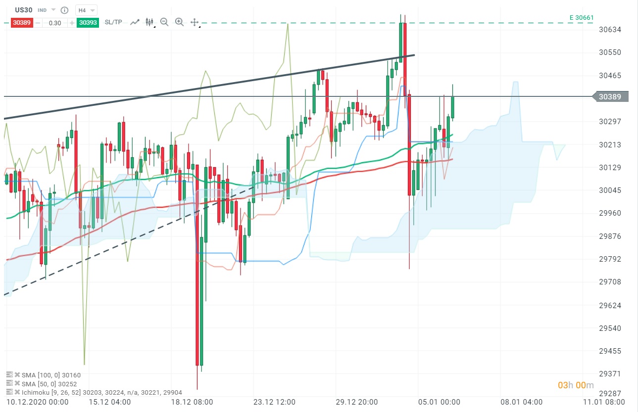 Opinion : Le Dow Jones est parvenu à sortir par le haut de son nuage, porté par les élections en Georgie, contrairement au Nasdaq fortement pénalisé. Le nuage agira donc en tant que support, renforcé par la SMA 50 (ligne verte), et la SMA 100 (ligne rouge) servira de stop-loss à 30 160 pts Tout retour vers cette zone sera un bon point d’entrée dans l’attente d’un rebond en direction des 30 660 pts.