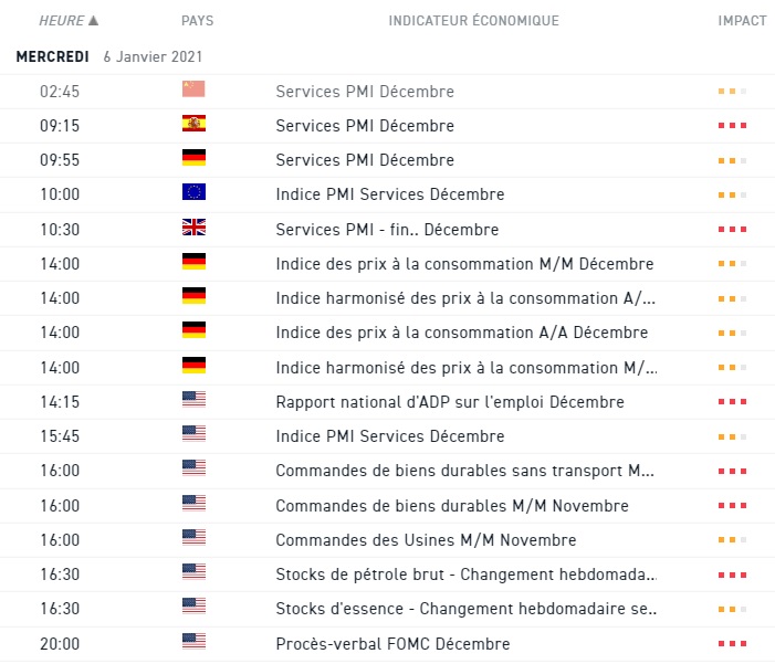 Les indices américains ont terminé la journée d'hier à la hausse. Le S&P 500 a gagné 0,71%, le Dow Jones 0,55% et le Nasdaq 0,95%. Russell 2000 a gagné 1,71%. Concernant les élections en Georgie, selon les prévisions d'Edison Research, le démocrate Raphael Warnock a remporté le second tour au Sénat contre le républicain sortant Kelly Loeffler. Cependant, le résultat n'a pas encore été déterminé lors du second tour de scrutin pour le siège de l'Etat du Sud au Sénat, opposant le challenger démocrate Jon Ossoff au républicain sortant David Perdue. Concernant le marché pétrolier, L'OPEP+ a convenu que la Russie et le Kazakhstan augmenteront leur production de 75 000 bpj au total en février et de 75 000 bpj supplémentaires en mars. L'Arabie Saoudite a volontairement accepté de réduire sa production d'un million de bpj. Cette nouvelle entente permet aux pétroles d’évoluer aux niveaux de fin février 2020. La séance d’aujourd’hui sera rythmée par les révisions des PMI des services en provenance de l’UE, et le rapport de l’ADP aux Etats-Unis sera très attendu, dans l’attente du rapport NFP de vendredi.