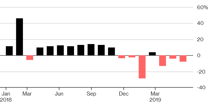 Variation annuelle en % des exportations chinoises vers les Etats-Unis basée sur la valeur en dollars - Source: Bloomberg - Administration générales de douanes de Chine
