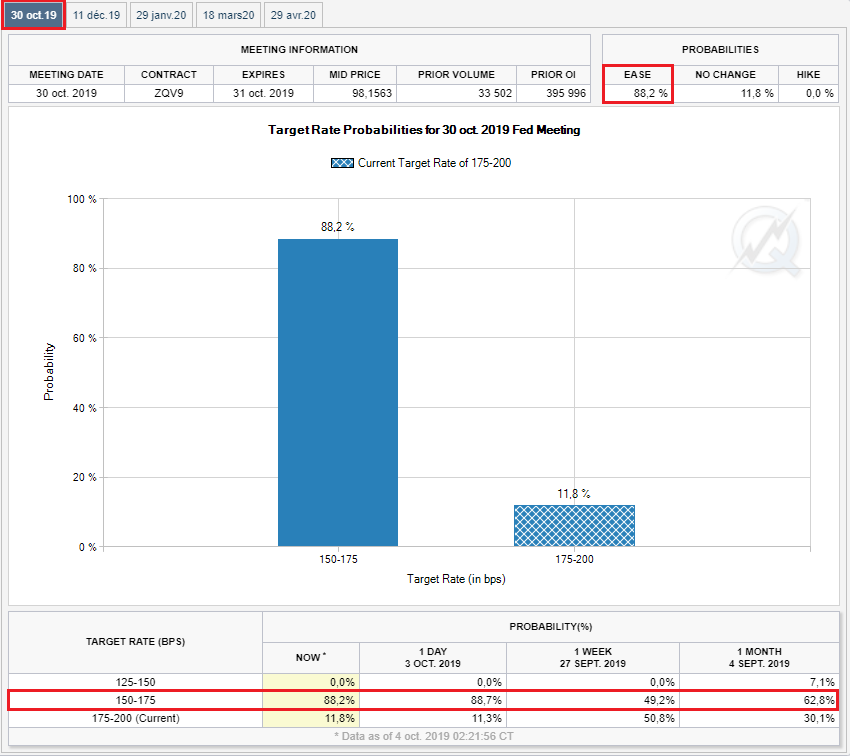 Autre rendez-vous important et non des moindres, le discours de Jerome Powell à 20h00 sera très suivi par les marchés, puisque ces derniers anticipent une réduction de 25 points de base de la fourchette des taux fédéraux à l’issue de la réunion du FOMC le 30 octobre 2019. Le Président de la Réserve fédérale américaine pourra donc donner des indications précieuses aux investisseurs quant à la possibilité d’une telle intervention. Finalement tout dépendra du rapport sur l’emploi, puisque si le rapport fait état d’une création d’emploi supérieure ou en ligne avec les attentes, cela viendra diminuer la probabilité d’une intervention de la Fed à la fin du mois. Pour rappel, la Fed avait annoncé lors de sa réunion précédente qu’il n’y aura pas d’autre réduction de taux au vue de la situation économique actuelle. Cependsant, les membres du FOMC sont très divisés quant à la politique monétaire que mène actuelle la Fed : plusieurs membres préféreraient que la Fed ne procède pas à de nouvelles baisses de taux, alors que d’autres membres plaident en faveur d’une telle action.