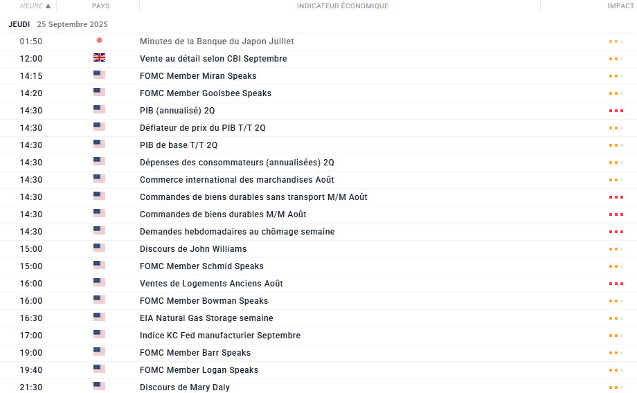 Jusqu’à sept responsables de la Fed, dont Williams, Goolsbee, Bowman, Barr, Logan, Daly et Schmid, prendront la parole aujourd’hui. Leurs déclarations seront scrutées pour anticiper les prochaines réunions d’octobre et de décembre.