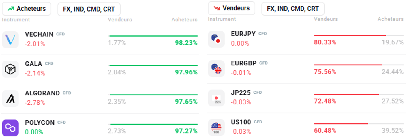 "Ce contenu est une communication marketing au sens de l'art. 24, paragraphe 3, de la directive 2014/65 /UE du Parlement européen et du Conseil du 15 mai 2014 concernant les marchés d'instruments financiers et modifiant la directive 2002/92 /CE et la directive 2011/61 /UE (MiFID II). La communication marketing n'est pas une recommandation d'investissement ou une information recommandant ou suggérant une stratégie d'investissement au sens du règlement (UE) n°596/2014 du Parlement européen et du Conseil du 16 avril 2014 sur les abus de marché (règlement sur les abus de marché) et abrogeant la directive 2003/6 / CE du Parlement européen et du Conseil et directives 2003/124 / CE, 2003/125 / CE et 2004/72 / CE de la Commission et règlement délégué (UE) 2016/958 de la Commission du 9 mars 2016 complétant le règlement (UE) n°596/2014 du Parlement européen et du Conseil en ce qui concerne les normes techniques de réglementation relatives aux modalités techniques de présentation objective de recommandations d'investissement ou d'autres informations recommandant ou suggérant une stratégie d'investissement et pour la divulgation d'intérêts particuliers ou d'indications de conflits d'intérêt ou tout autre conseil, y compris dans le domaine du conseil en investissement, au sens de l'article L321-1 du Code monétaire et financier. L’ensemble des informations, analyses et formations dispensées sont fournies à titre indicatif et ne doivent pas être interprétées comme un conseil, une recommandation, une sollicitation d’investissement ou incitation à acheter ou vendre des produits financiers. XTB ne peut être tenu responsable de l’utilisation qui en est faite et des conséquences qui en résultent, l’investisseur final restant le seul décisionnaire quant à la prise de position sur son compte de trading XTB. Toute utilisation des informations évoquées, et à cet égard toute décision prise relativement à une éventuelle opération d’achat ou de vente de CFD, est sous la responsabilité exclusive de l’investisseur final. Il est strictement interdit de reproduire ou de distribuer tout ou partie de ces informations à des fins commerciales ou privées. Les performances passées ne sont pas nécessairement indicatives des résultats futurs, et toute personne agissant sur la base de ces informations le fait entièrement à ses risques et périls. Les CFD sont des instruments complexes et présentent un risque élevé de perte rapide en capital en raison de l'effet de levier. 71% de comptes d'investisseurs de détail perdent de l'argent lors de la négociation de CFD avec ce fournisseur. Vous devez vous assurer que vous comprenez comment les CFD fonctionnent et que vous pouvez vous permettre de prendre le risque probable de perdre votre argent. Avec le Compte Risque Limité, le risque de pertes est limité au capital investi."