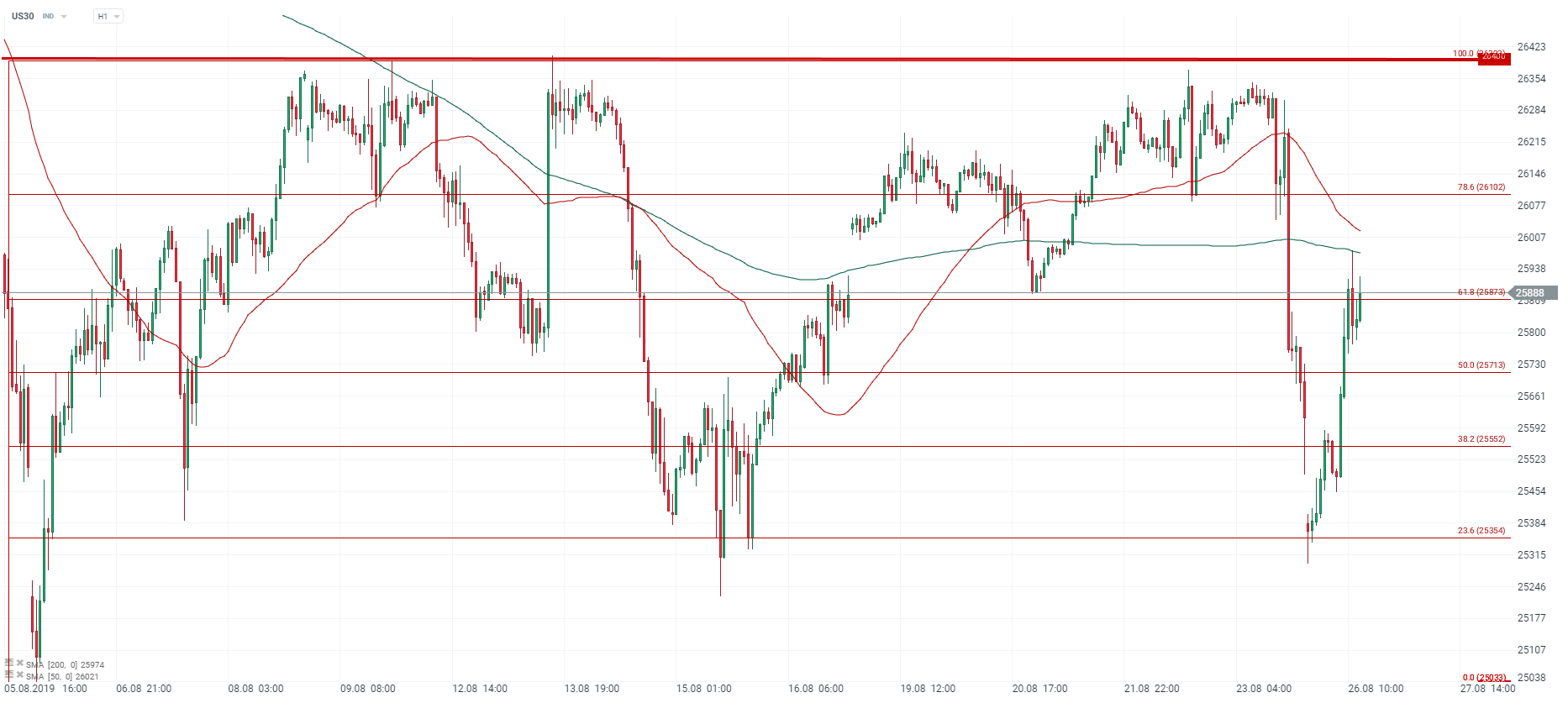 Représentation graphique de l’indice Dow Jones (US30) en unité de temps horaire (H1). Les cours sont parvenus à s’affranchir de la zone de résistance matérialisée par les 61.8 % des retracements de Fibonacci autour des 25875/25900 points. Source : xStation5.